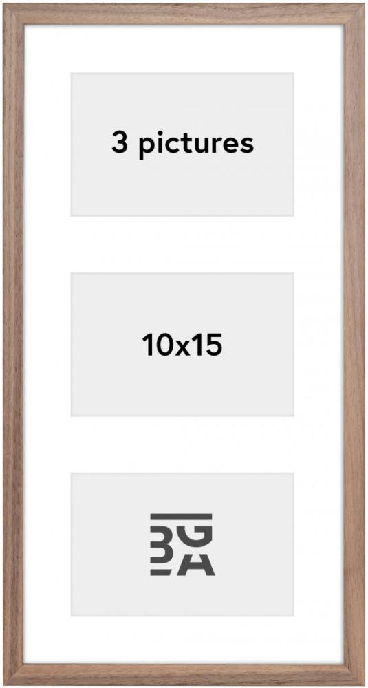 Den minimalistiska designen sätter motivet i fokus, för att dina favoritbilder ska hamna i blickfånget. Ramen finns i flera utföranden, varav denna är en variant i ljus valnöt med plats för 3 bilder i storlek 10x15 cm.