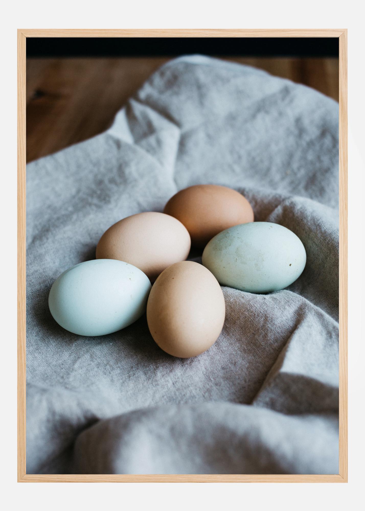 En stillebenposter med fem ägg på en vit kökshandduk på bordet. Äggen är i olika bruna och vita färger och ser ut att vara nyligen värpta. De varma tonerna skapar en rustik känsla där du kan uppskatta den naturliga levande atmosfären. Perfekt för en köksmiljö.