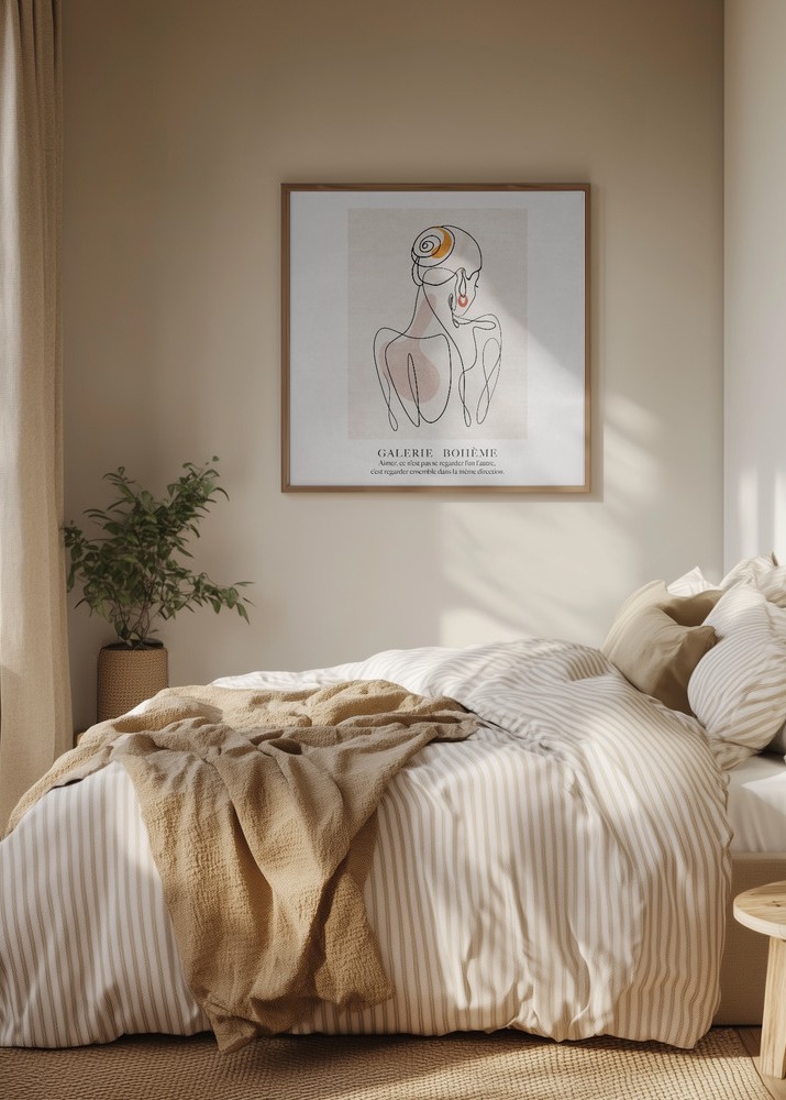 Denna eleganta poster föreställer en minimalistisk linjeteckning av en kvinna i profil. Stilrent och sofistikerat, motivet fångar essensen av modern konst med sina mjuka, organiska linjer. Perfekt för dig som söker ett konstverk som blandar enkelhet och djup.