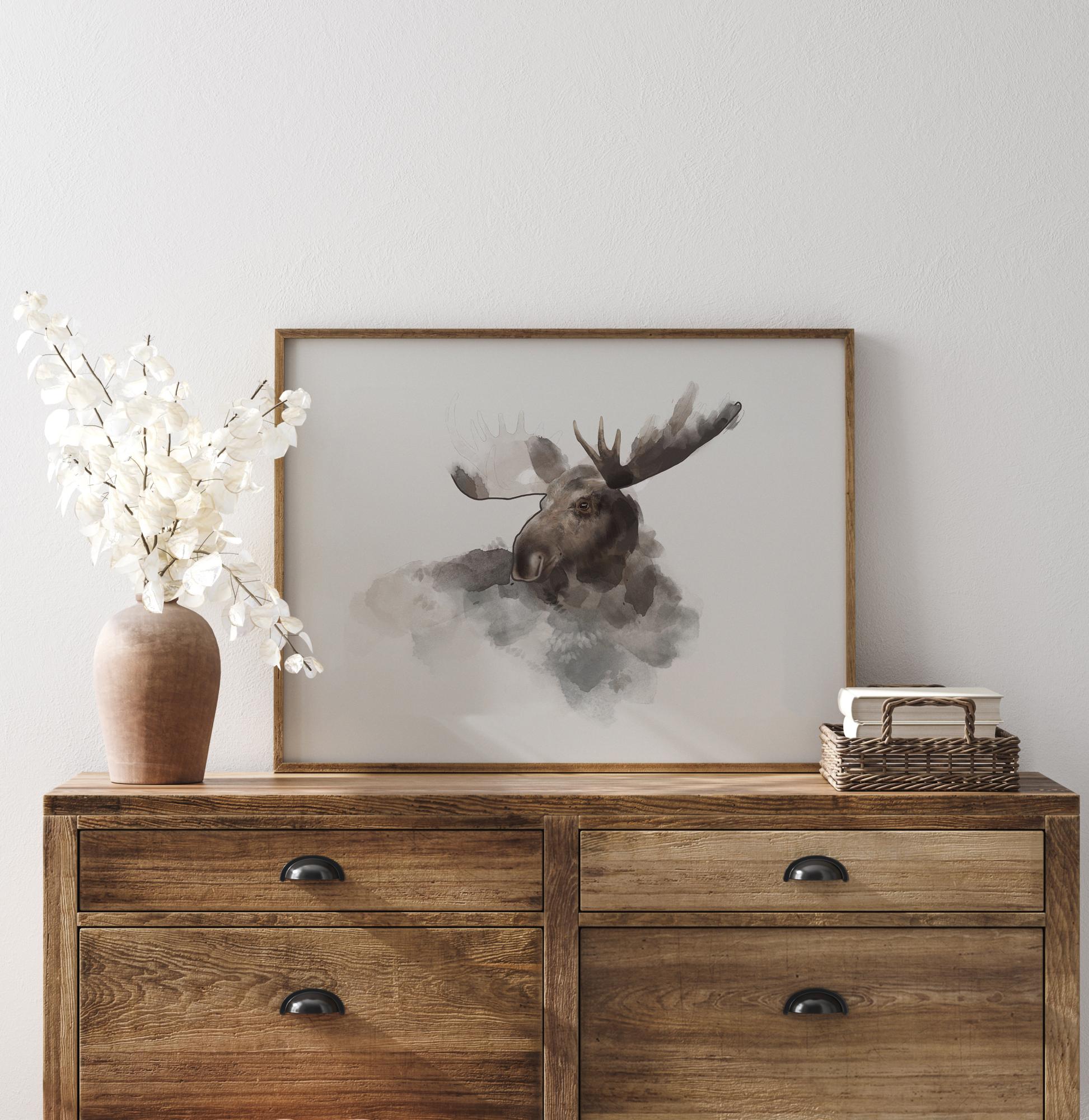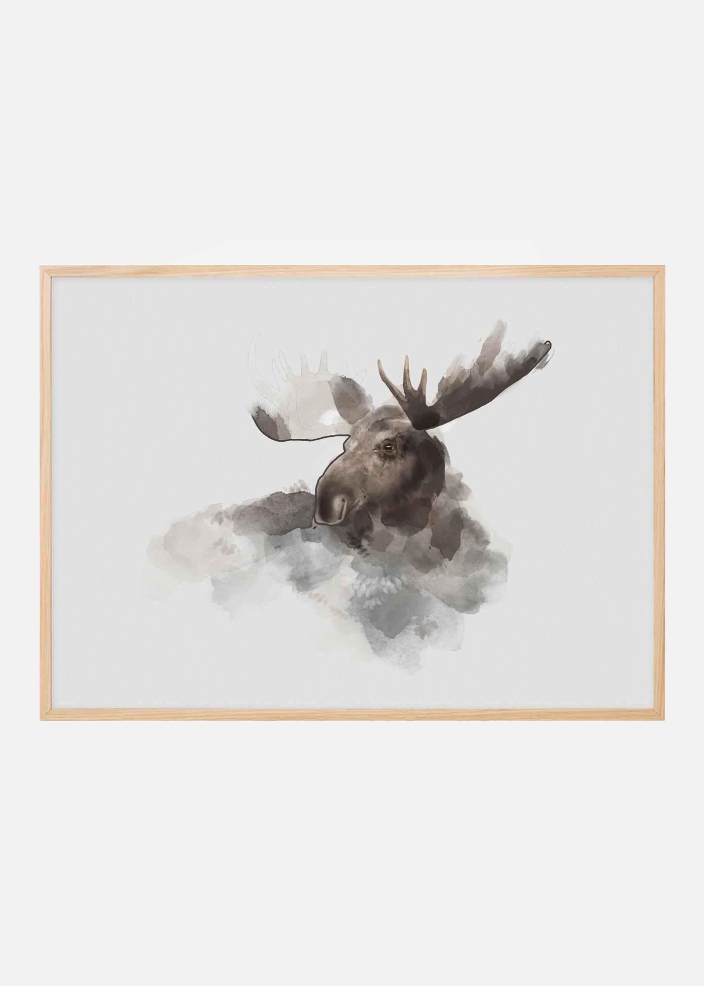 En akvarellposter med en älgs huvud. De mjuka penseldragen bygger gradvis uppe på älgens ansikte, hans horn fortfarande inte fullt utformade. Häng den här molnlika bilden på en neutral vägg för att behålla den mjuka elegansen i ditt hem.
