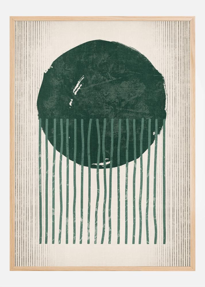 Denna affisch bjuder in till en fantasifull utforskning av det marina, med en stiliserad bild som för tankarna till en manet med sina strömmande tentakler. Den starka cirkulära formen i smaragdgrönt är både fängslande och lugnande, medan de vitmålade, lodräta strecken som utgör 'tentaklerna' skapar en känsla av rörelse. Detta är en konstnärlig tolkning som kombinerar abstrakt form med biologisk fantasi och erbjuder en unik, modern vändning på havstemat.