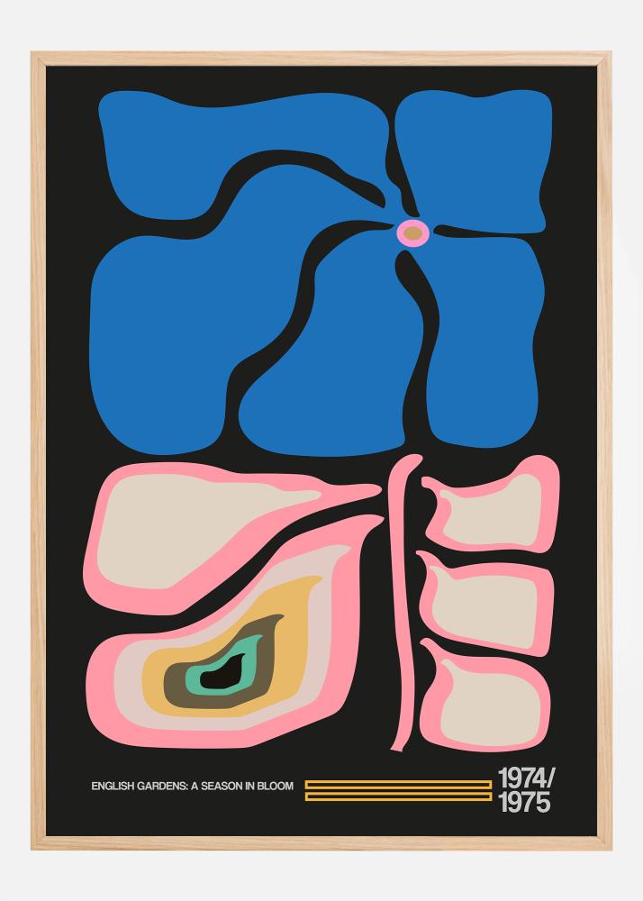 Denna kreativa och färgstarka 'English Gardens: A Season in Bloom' poster är en estetisk hyllning till trädgårdsblomningens mångfald och prakt. Postern fångar ögat med dess starka, blå blomma som står i kontrast mot en svart bakgrund, kompletterad med accentfärger i rosa, beige, och en antydan av grönt. Denna speciella kombination av färger erbjuder en djärv och samtida tolkning av en klassisk engelsk trädgård i full blom. Årtalet '1974/1975' tillför en historisk dimension som kanske antyder en betydelsefull period för trädgårdar eller konsten.