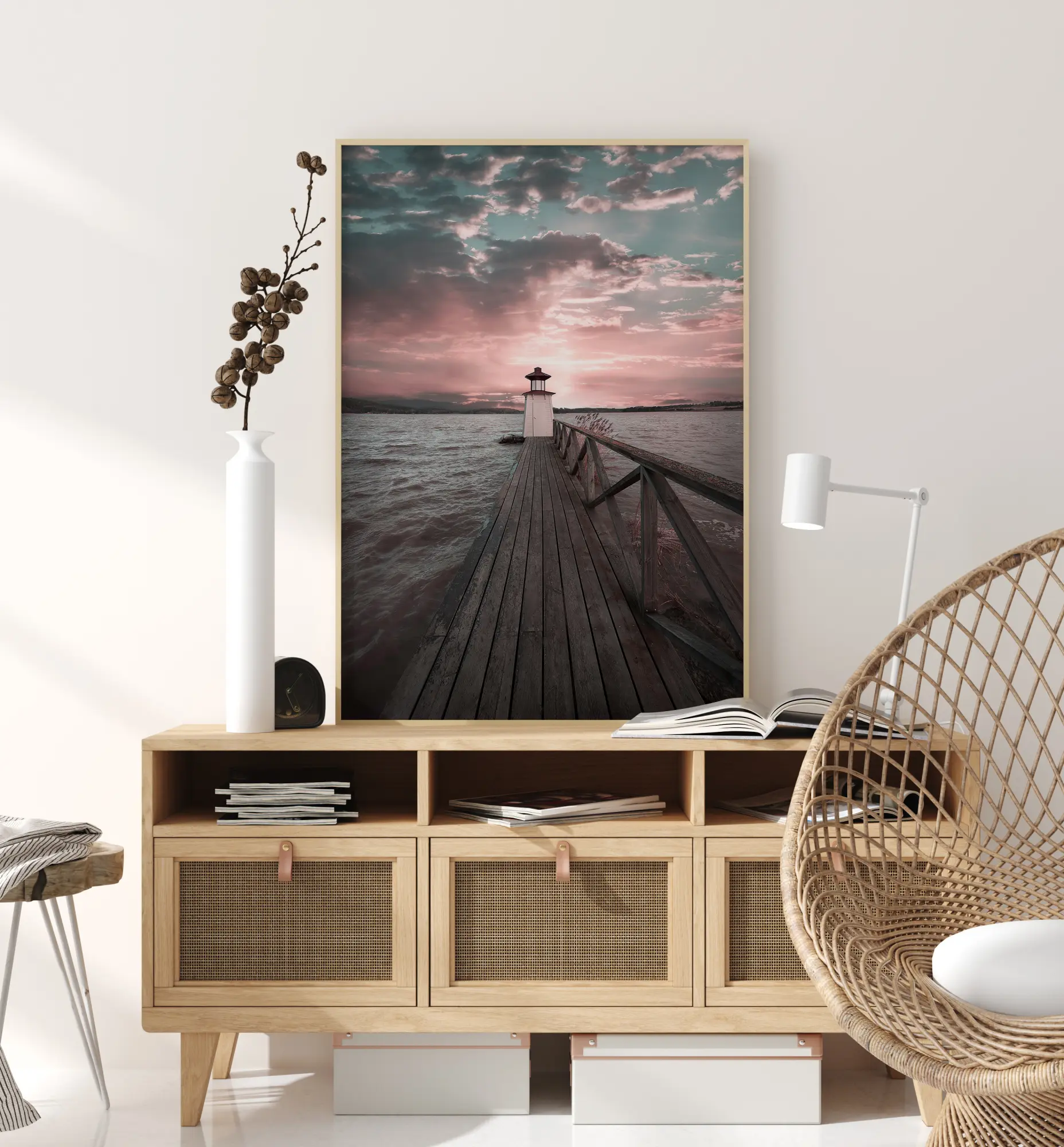 En romantiskt poster som visar en fyr i havsdimman. En blandning av mjuka rosa pastellfärger skapar en varm känsla. Se om du kan höra och känna havsbrisen när du hänger detta romantiska tryck i ditt hem.