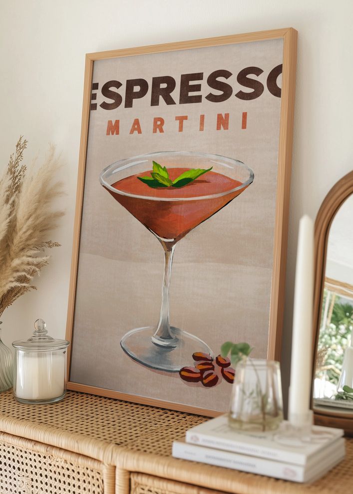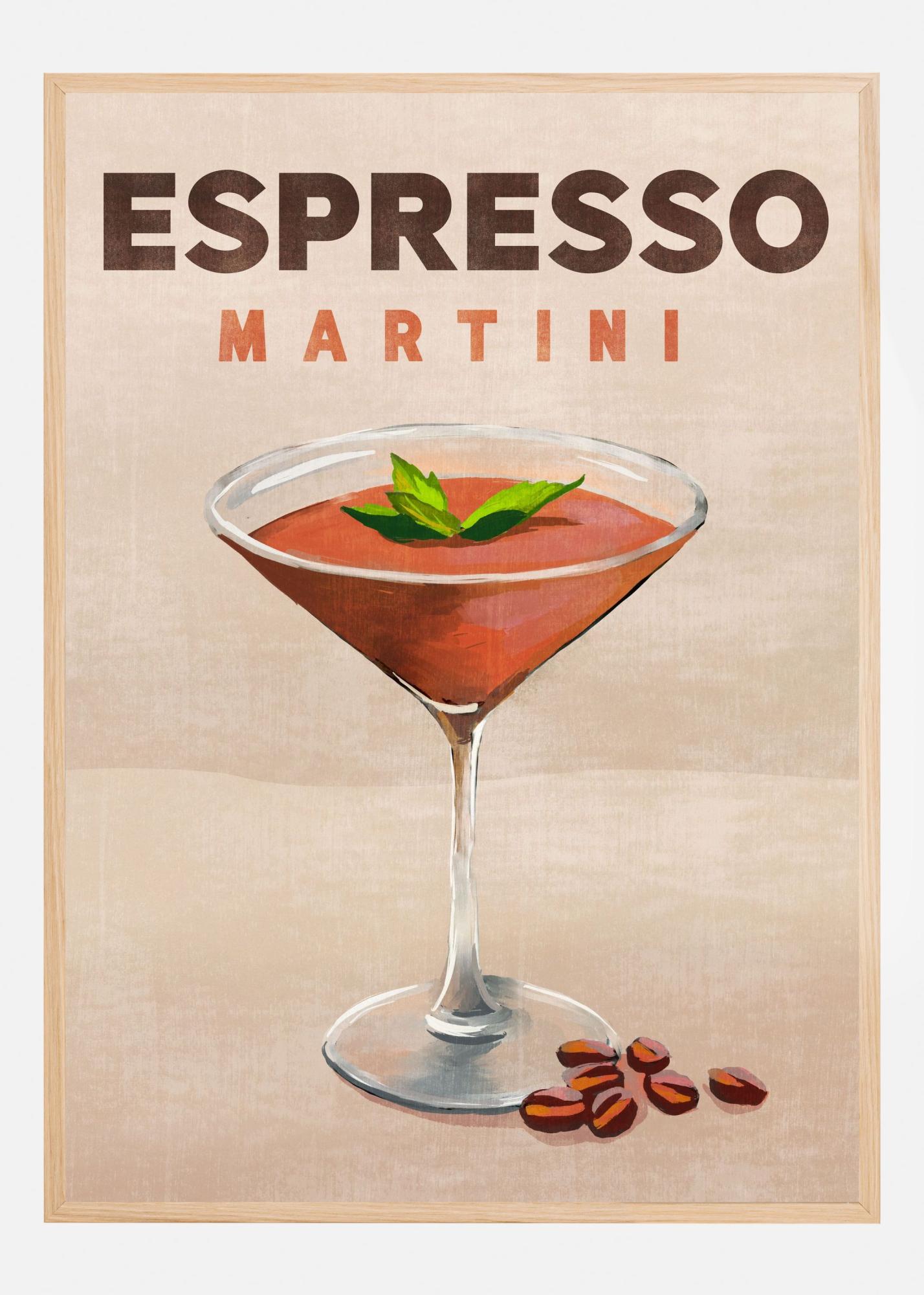 Den här stilrena postern fångar essensen av en klassisk Espresso Martini, perfekt för att ge ditt hem eller kontor en sofistikerad touch. Motivet visar en elegant cocktail i en martiniglas med en krämig brun ton, toppad med gröna myntablad. Den lågmälda bakgrunden förstärker dryckens rika nyanser och framhäver dess charm, vilket gör denna print till en utmärkt accent för moderna och eleganta inredningsstilar.