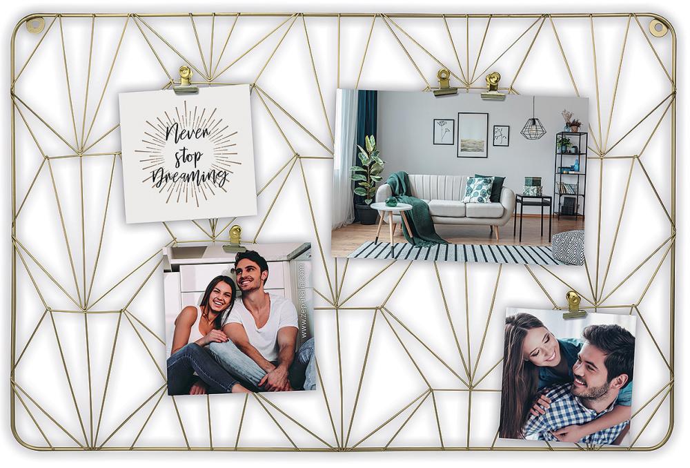 Collageram designad som en anslagstavla där du fäster dina foton med clips. Ramen är tillverkad i metall och går i en guldig nyans. Eftersom du själv fäster dina bilder kan du välja att blanda foton i olika storlekar och även ta ut din kreativitet och fästa exempelvis mindre posters eller fina lappar! Ramen mäter 62x41 cm i yttermått. Denna ram passar extra bra ovanför skrivbordet, i köket eller någon annanstans där den får komma till sin dekorativa och funktionella rätt. Väggfäste finns.