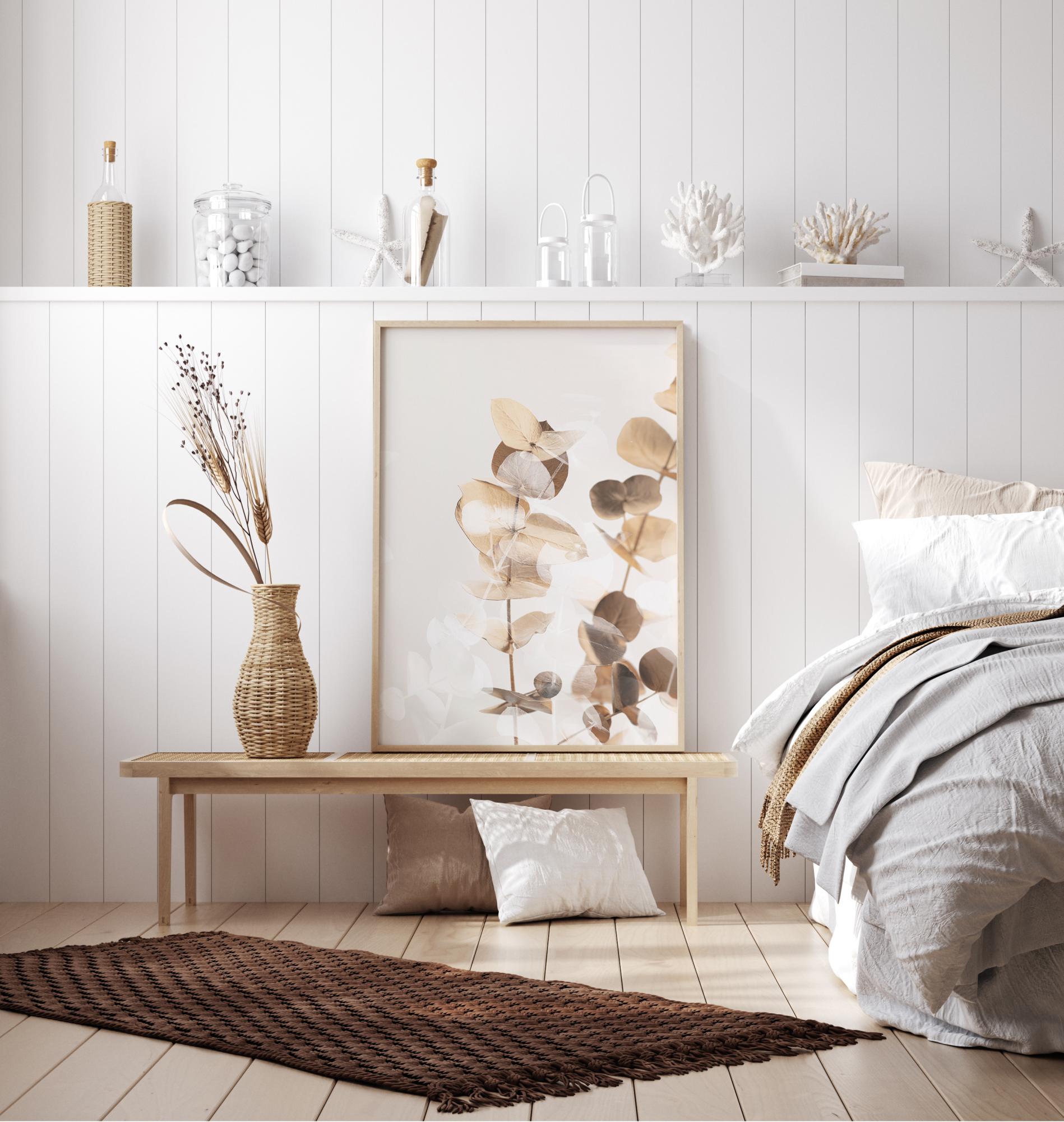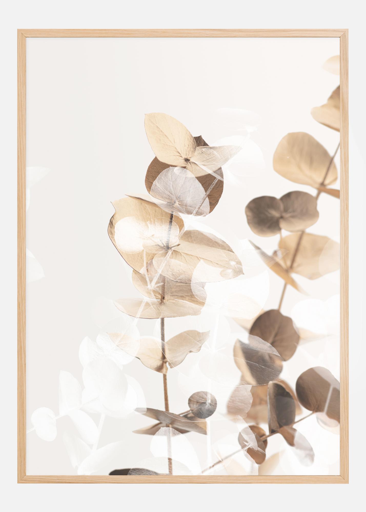 En gyllene poster med eukalyptusblad och grenar. De guldfärgade och bruna bladen sticker ut i en skimrande form mot den enkla vita bakgrunden. För att förstärka dessa löv, matcha med en liknande guld- eller mörkt cremefärgad vägg för extra elegans.