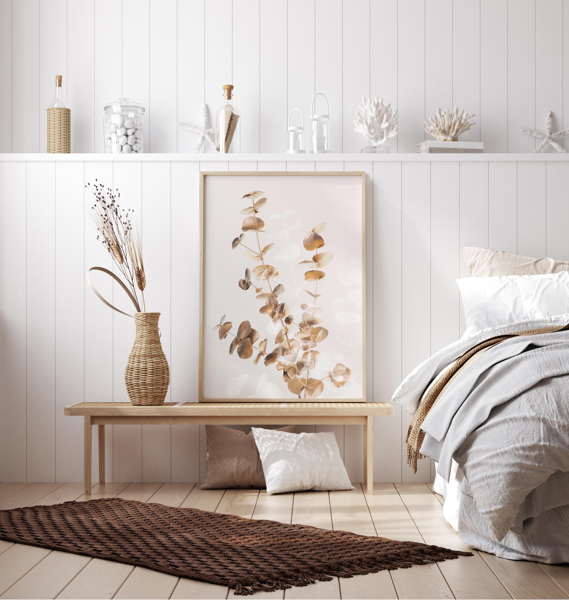 En härlig poster med kvistar av gyllene eukalyptus. De guldfärgade och bruna bladen är mjuka där de sticker ut från den vita bakgrunden. Bladen är runda, vilket skapar fina former i bilden. Denna poster ger en lugn och stilren känsla till ditt hem.