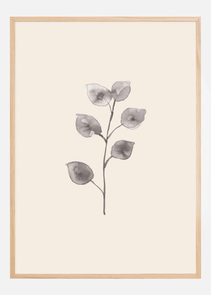 En elegant poster med en enkel målning av en gren av eukalyptus. Bladen är gjorda i akvarellstil så att de är mjuka och kanterna nästan har suddats ut. I en enkel grå ton sticker bladen ut från den vita bakgrunden. Häng den här på en grön vägg för att tillföra färg.