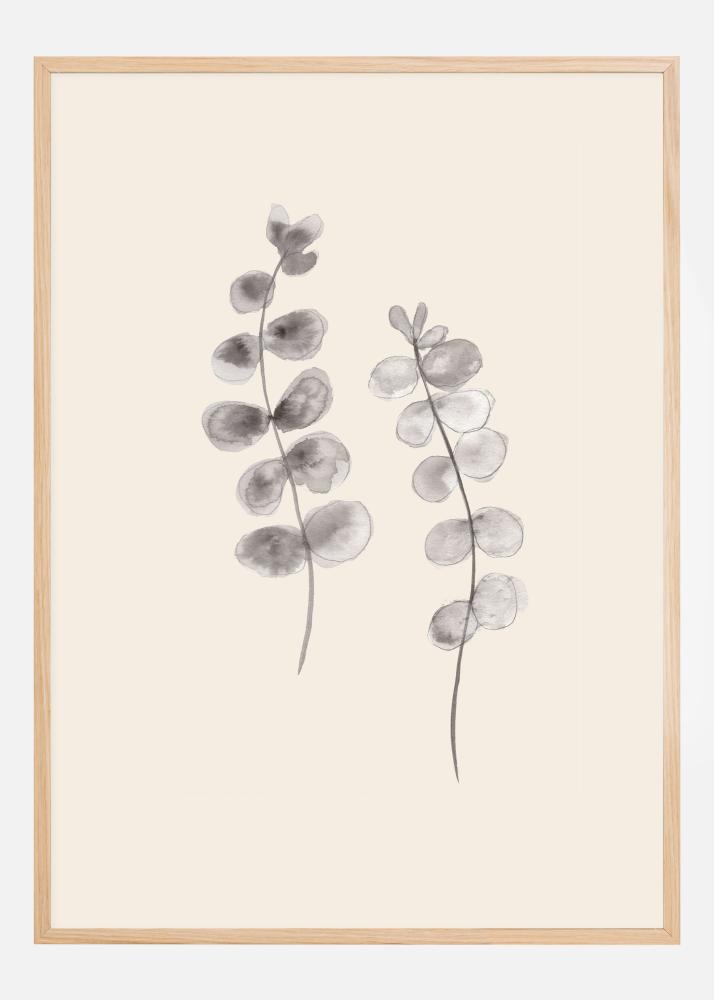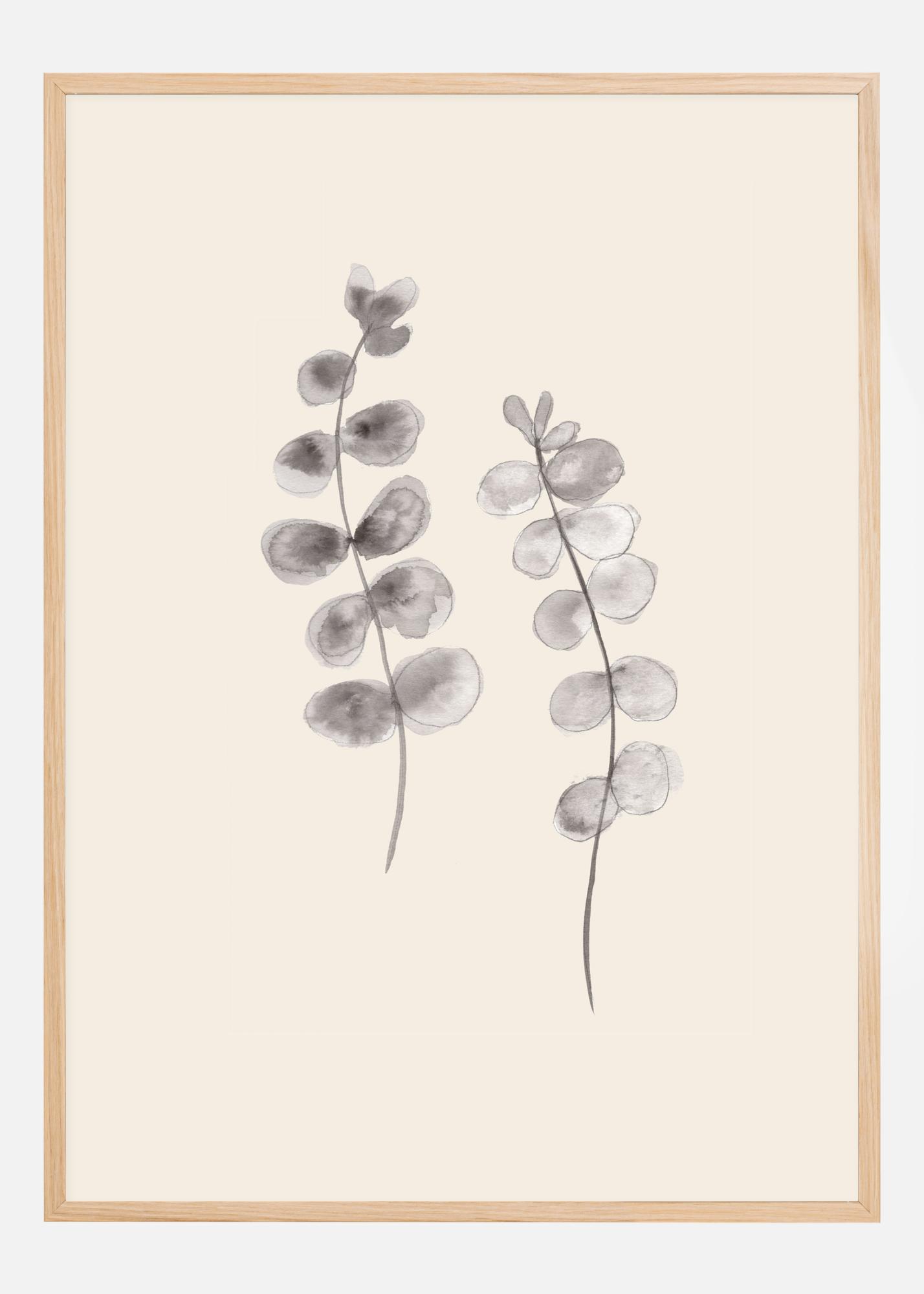 En botanisk poster med två gråa kvistar med eukalyptusblad. I mitten av en vit bakgrund finns två gråmålade grenar med eukalyptusblad. De böjer sig tillsammans för att skapa en mjuk kurva som leder blicken upp genom postern. Häng denna lummiga dans i ditt hem för en lugnande känsla.