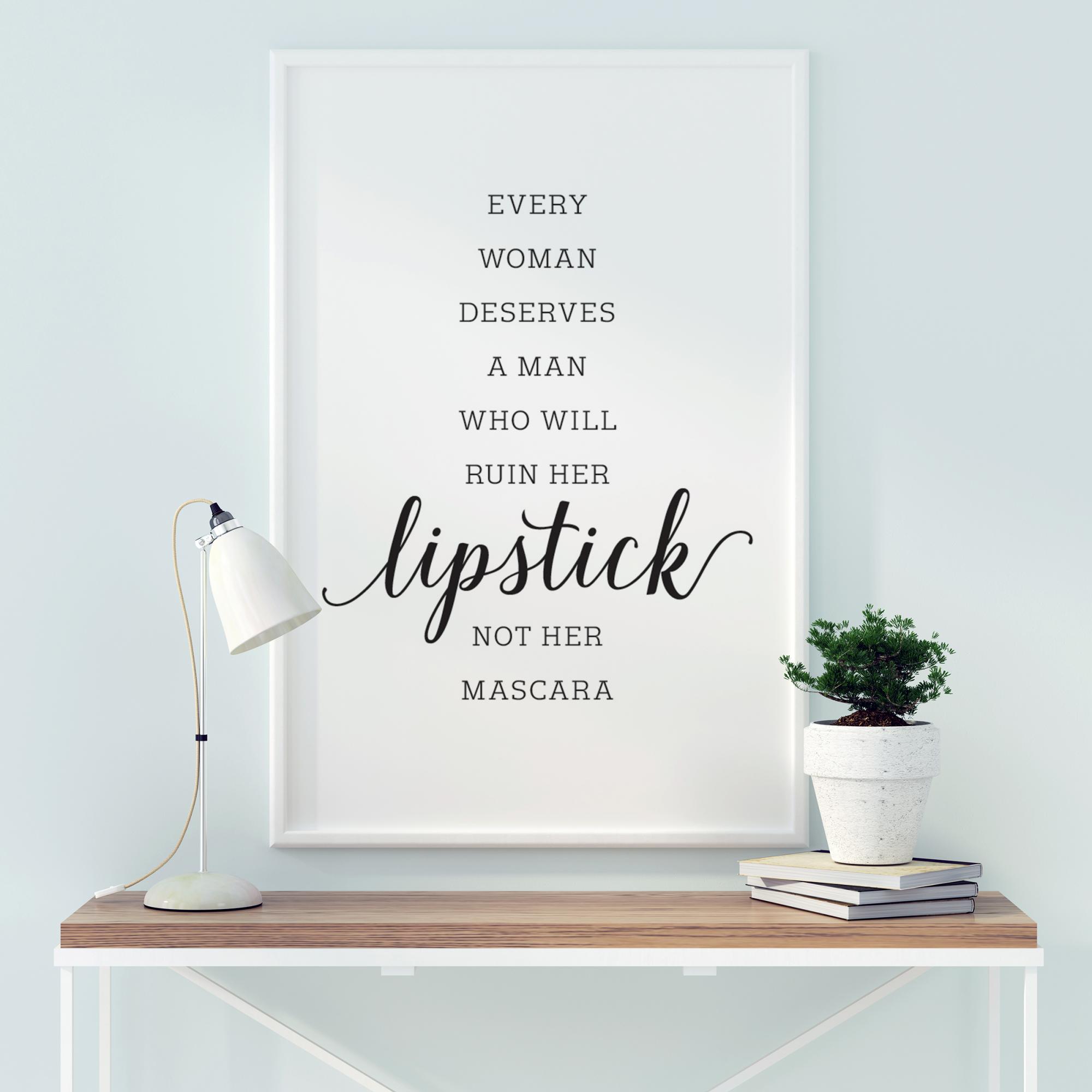 En motiverande poster med ett starkt citat för att få dig att komma igång på morgonen. ”Every woman deserves a man who will ruin her lipstick, not her mascara”, Varje kvinna förtjänar en man som kommer att förstöra hennes läppstift, inte hennes mascara, är ord att leva med. Börja din dag rätt med den här enkla tanken på denna söta kalligrafiska och inspirerande bilden.