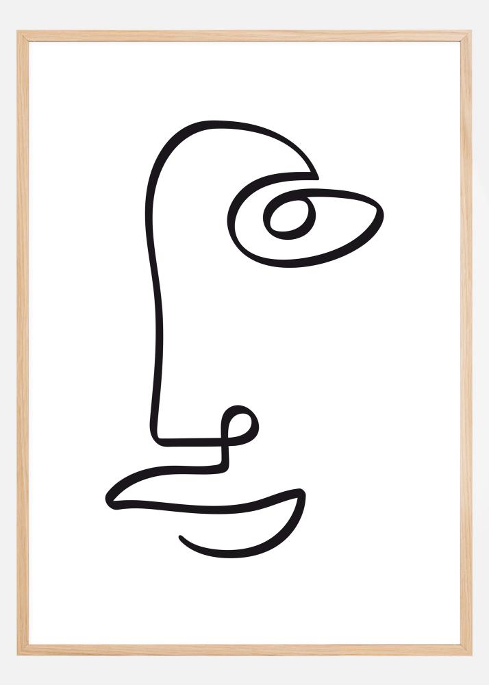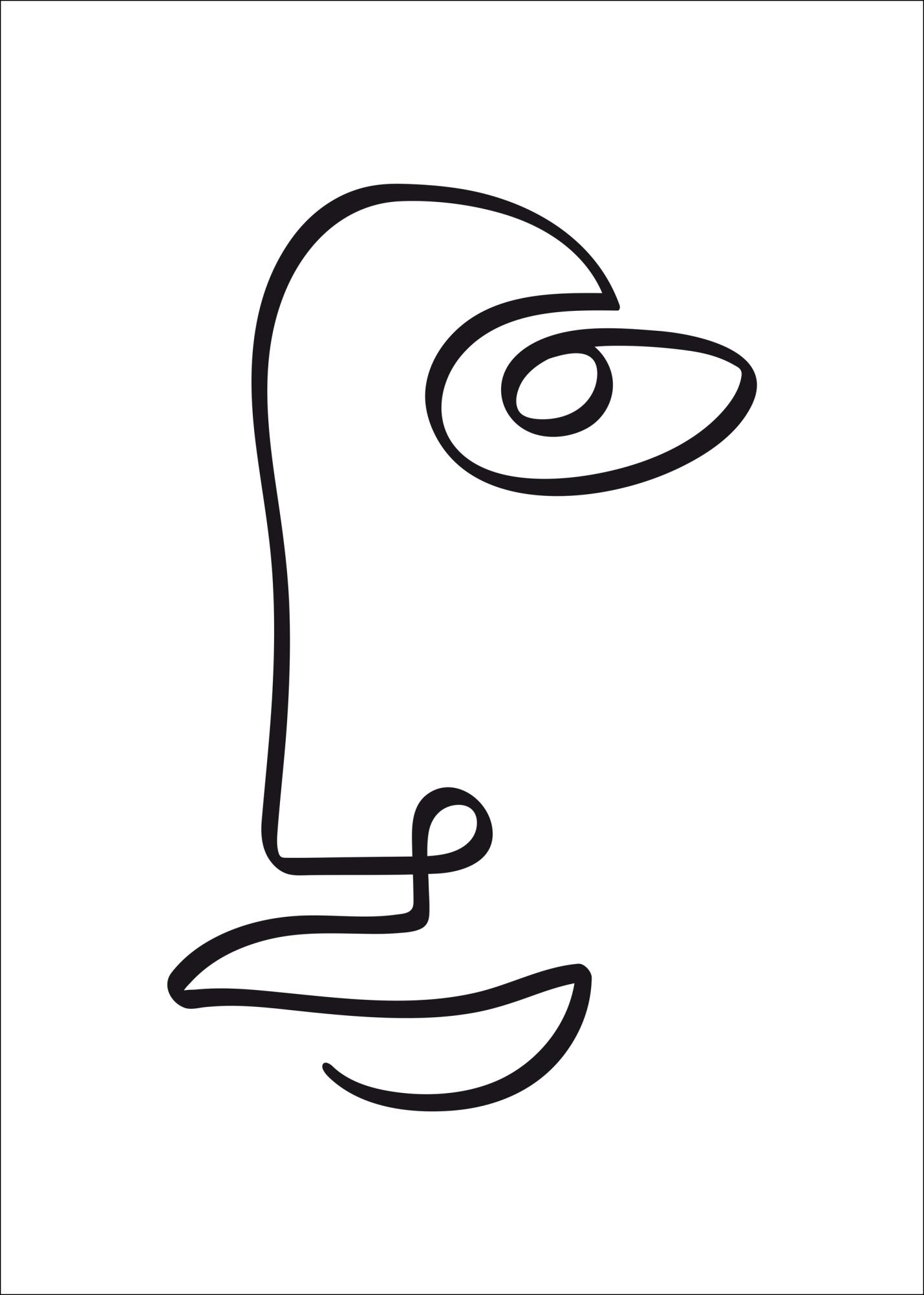 En abstrakt poster med ett ansikte, ritad med en svart linje. Den enkla svarta linjen vrider sig i bilden för att skapa ena sidan av ett ansikte utan att en enda gång lämna papperet. Begrunda den här enkla bilden när du hänger den hemma och försök att se andra figurer dolda i verket.