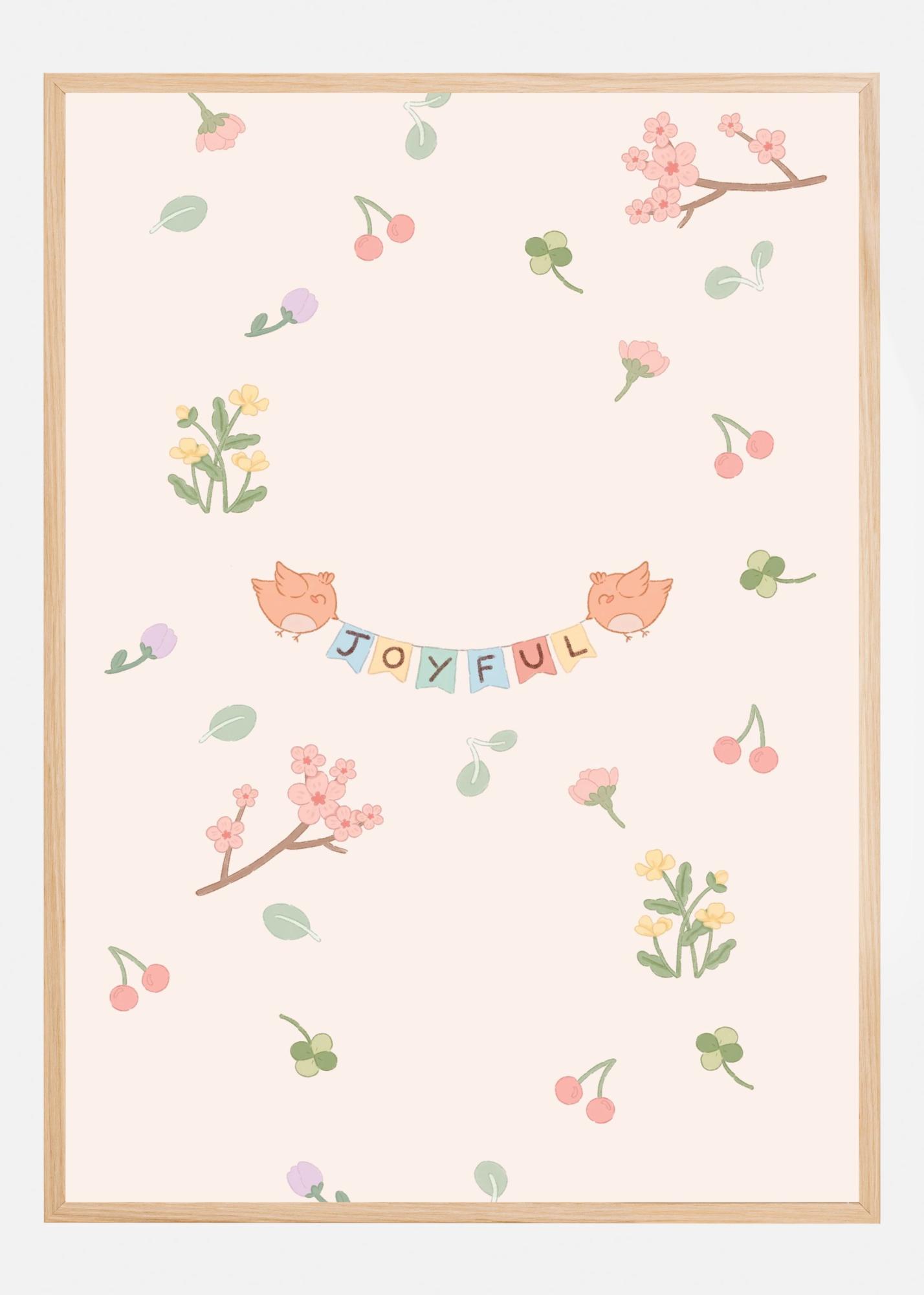 Skapa en atmosfär av glädje och stillsam charm i ditt hem med denna bedårande poster. Motivet framställer en ljuvlig samling av illustrerade blommor och växter, ackompanjerat av två förtjusande fåglar som bär på en vimpel med ordet "JOYFUL". Denna print är den perfekta blandningen av lekfullhet och lätthet, idealisk för att inbringa en känsla av positiv energi och försiktig naturkänsla till vilket rum som helst.