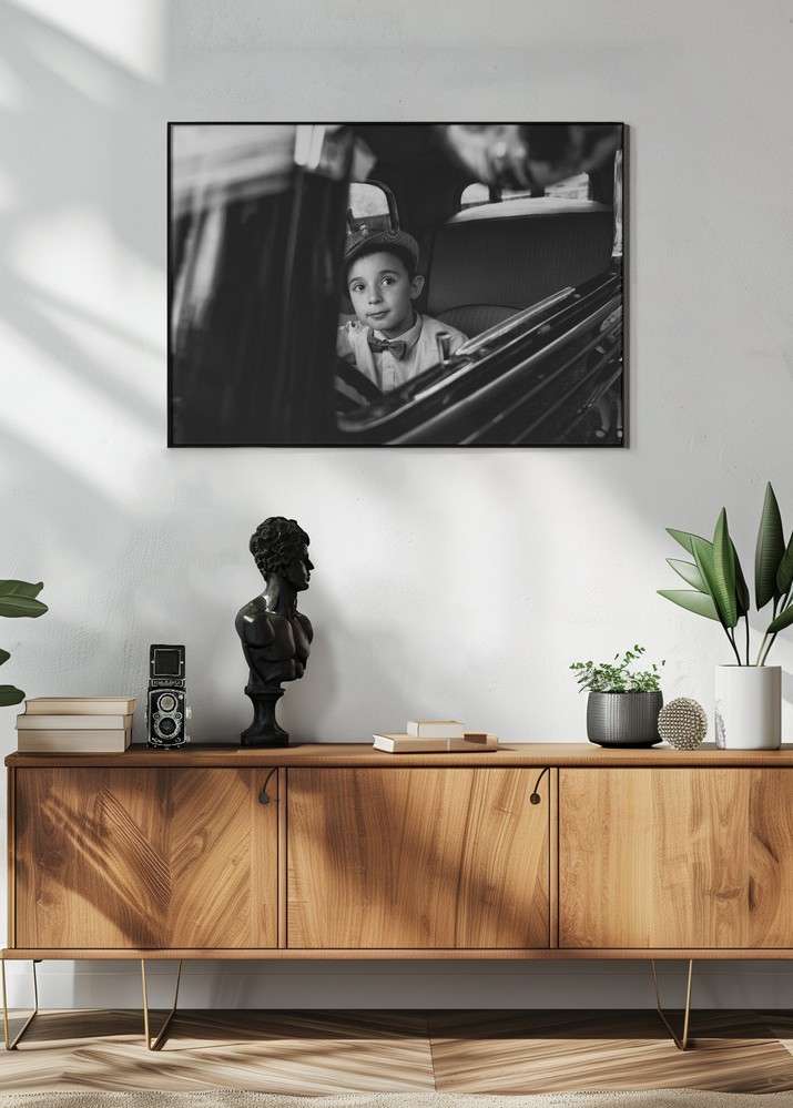 Denna svartvita poster fångar en tidlös scen med ett barn i fokus, sittande i en bil. Bilden utstrålar nostalgi och en känsla av historia, vilket gör den till ett perfekt tillskott i både modern och klassisk inredning. Det djupa svarta tillsammans med de subtila gråtonerna ger motivet en dramatisk kontrast som verkligen drar ögat till sig. Affischen är en fantastisk representation av fotografisk konst som enkelt blir en konversationsstartare i vilket rum den än hängs upp.