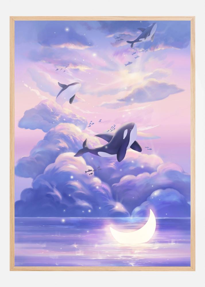 Denna drömlika poster avbildar en fantasifull himmel där eleganta valar svävar bland mjuka, ljust lila moln under en tidig kvällshimmel. Det är en print som tar fantasin på en resa långt bortom det vardagliga och framkallar en känsla av lugn och under. Den gradvis övergående färgpaletten av rosa, lila och blå toner skapar en harmonisk och avkopplande atmosfär som kompletteras av de vita och grå nyanserna på de flygande valarna och de svävande fåglarna.