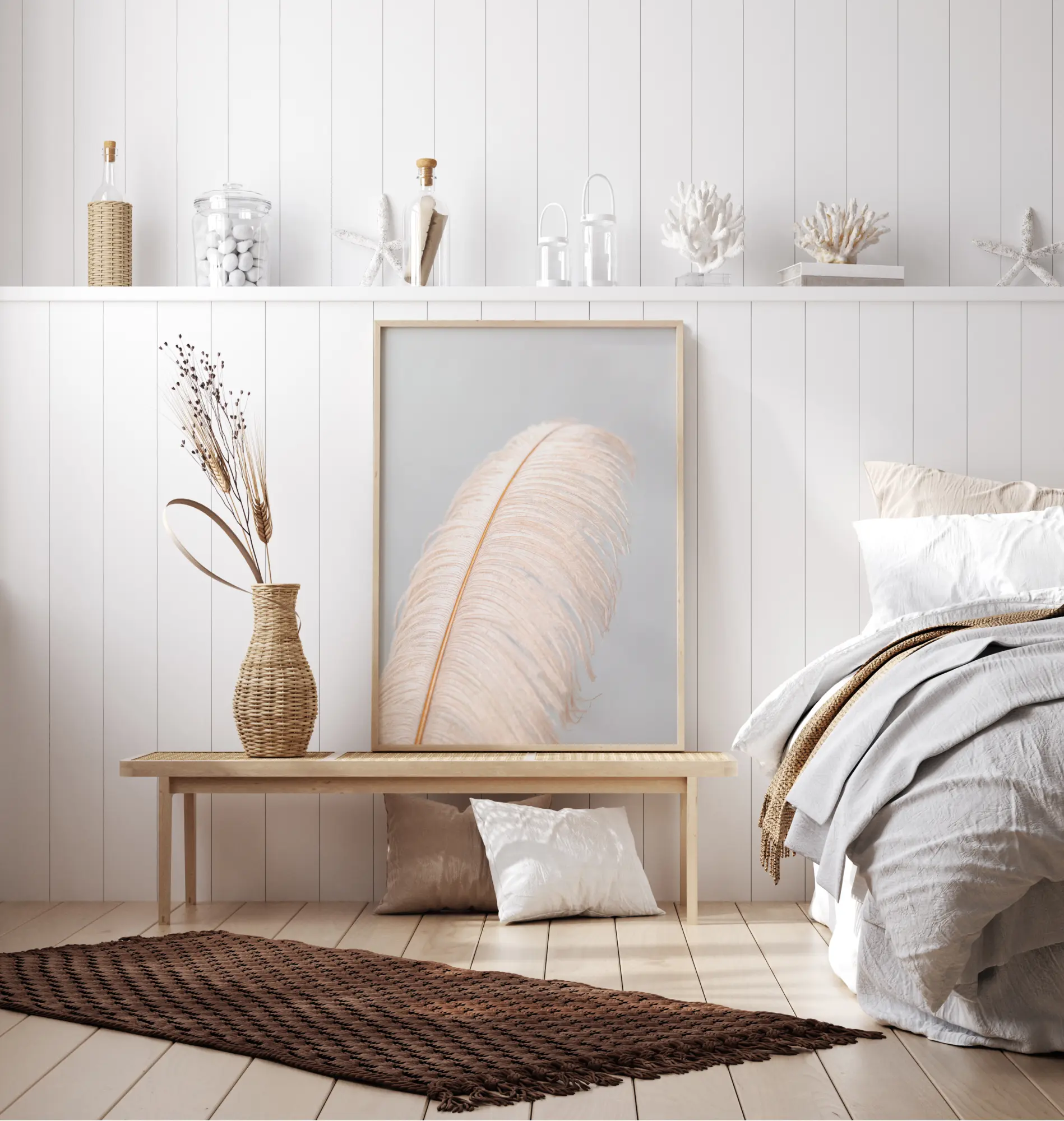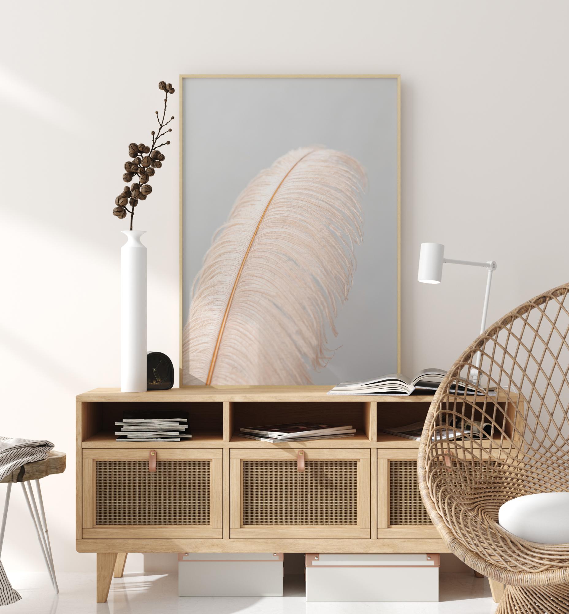 En närbildsposter med en stor strutsfjäder. Den mjuka vita fanstrålarna flödar på vardera sidan av det rosa centrala skaftet på fjädern. Fjädern är framför en duvblå bakgrund för att ge den här bilden en något sagolik känsla. Den är det perfekta tillskottet till ett barns rum.