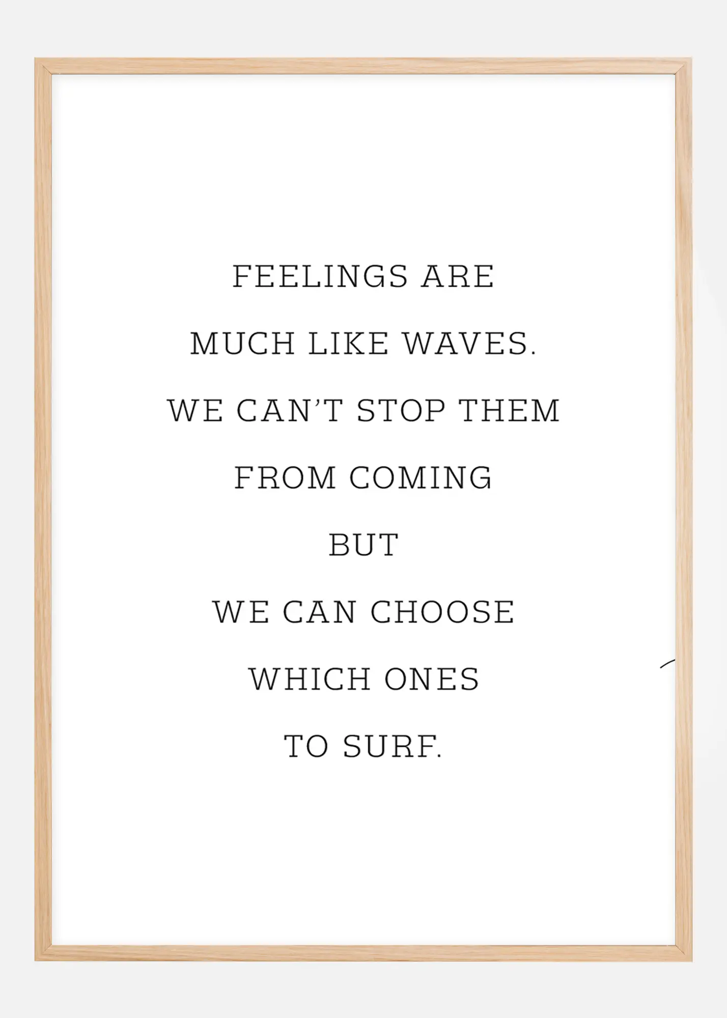 A motivational poster to keep you going every day. Feelings are Much like Waves. We Can't Stop Them From Coming But We Can Choose Which Ones to Surf. Kickstart your day with this strong quote in a simple type set on a plain white background.