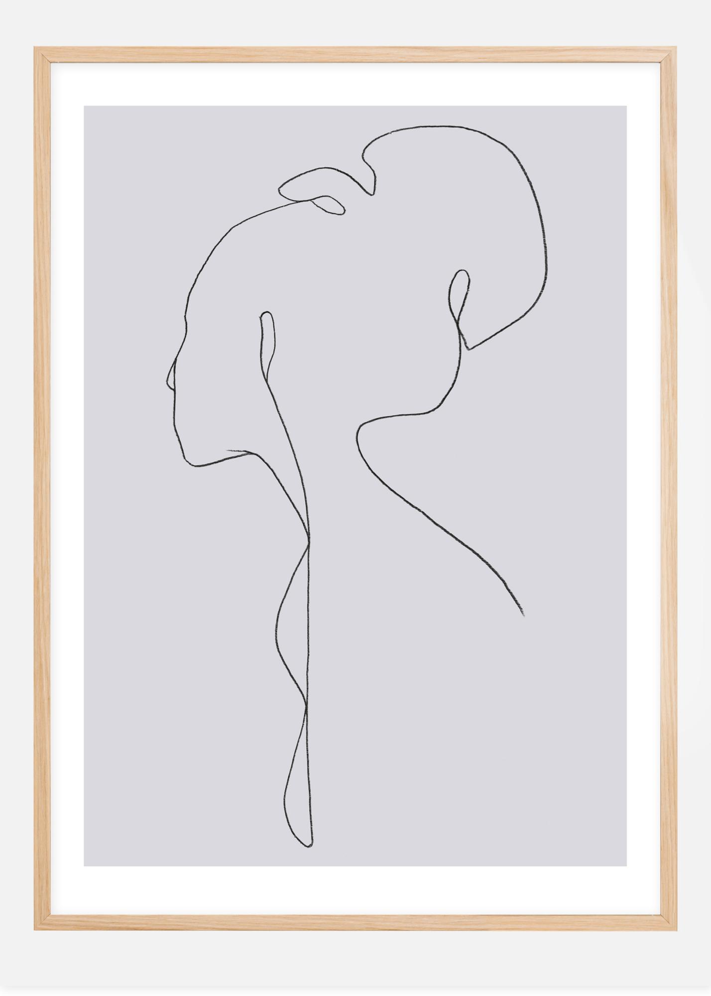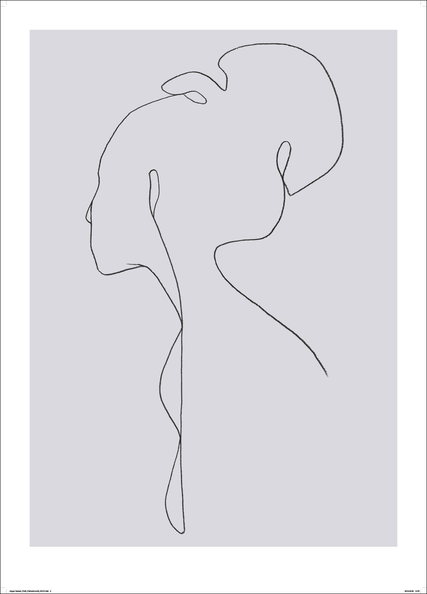 Med spröda svarta linjer mot en gråtonad bakgrund tar en kvinnas profil form. Hennes blick riktas ifrån betraktaren och hennes hår är uppsatt i en knut på huvudet. En vacker och stilren poster skapad av Jörgen Hansson Art.