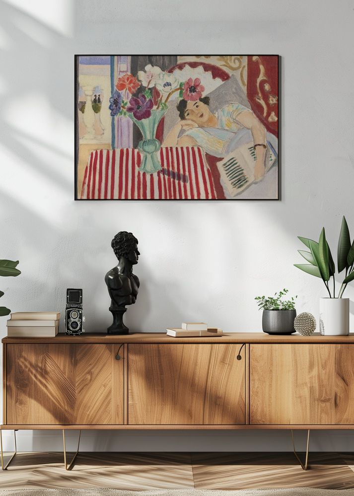 Denna affisch fångar en harmonisk scen där en kvinna vilar vid ett bord med en elegant vas fylld med blommor. Bordet är klätt i en röd- och vitrandig duk, vilket ger en dynamisk känsla till motivet. Damen vilar sitt huvud på handen medan hon bär en klänning i mjuka pastellfärger. Fönstret i bakgrunden ger ett djup och en känsla av sommarens ljus som strömmar in i rummet.