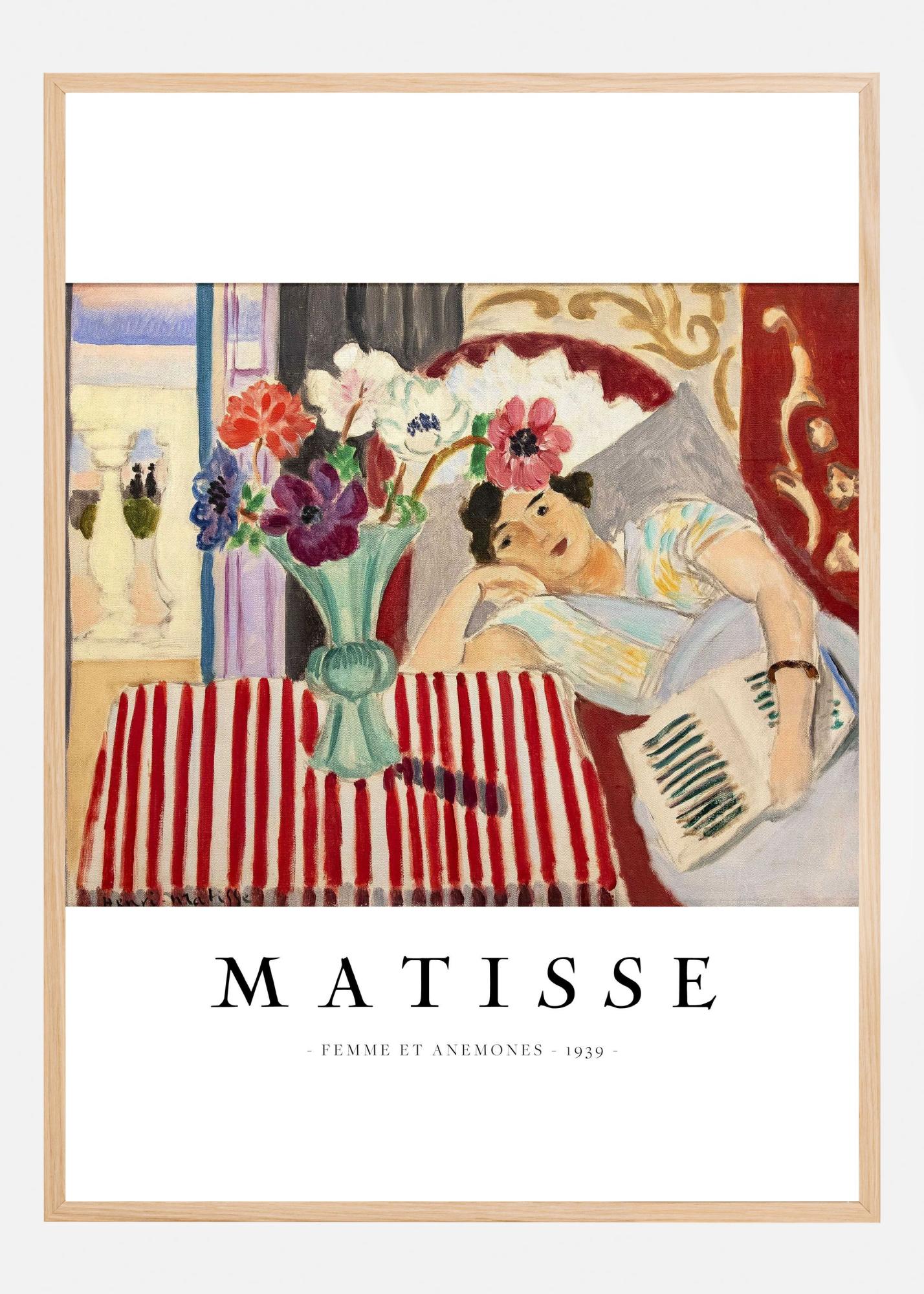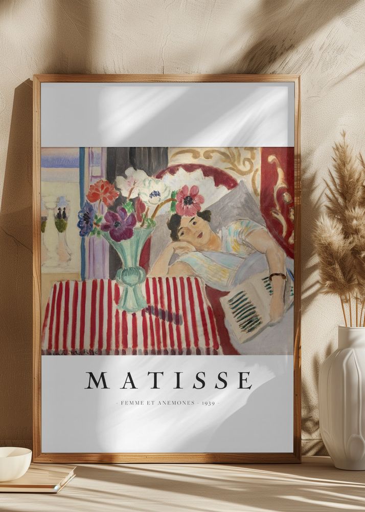 Denna eleganta poster fångar essensen av Matisse med sitt mästerliga motiv Femme et Anemones från 1939. Här ser vi en kvinna som vilar i en förtrollande scen, omgiven av en charmig bukett anemoner. Printets mjuka penseldrag och färgpalett väcker liv i rummet med dess tidlöshet och skönhet.