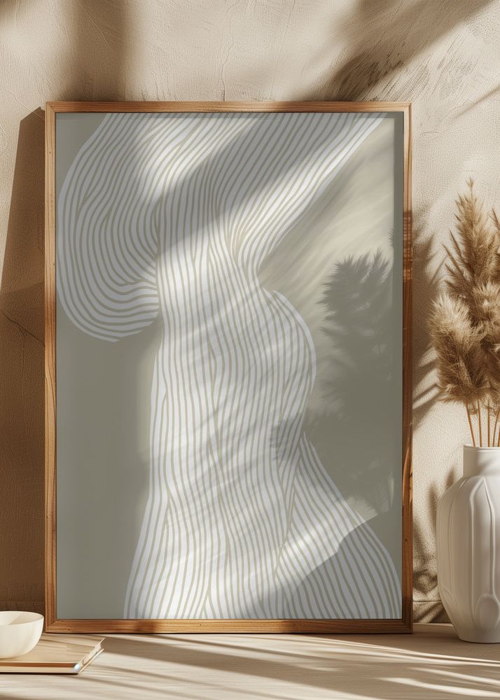 Denna stilfulla poster föreställer ett abstrakt motiv som spelar med linjernas flöde och dynamik för att skapa en känsla av rörelse och mjukhet. De vågiga linjerna bildar en mjukt konturerad form som påminner om en figur eller landskap, vilket ger en organisk och avslappnande känsla. Designen anknyter till modern minimalism och skulle passa väl i en skandinavisk inredningsstil eller som en diskret men intressant detalj i ett kontemporärt vardagsrum eller sovrum.