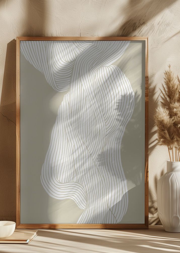 De varma nyanserna av beige i bakgrunden blandar sig harmoniskt med de dynamiska vita linjerna, vilket ger detta konstverk en mjuk och välkomnande atmosfär. Med sin neutrala färgpalett kan denna print enkelt integreras i olika rum och stilar, från ett minimalistiskt vardagsrum till ett lugnande sovrum. Häng den som en stående detalj eller kombinera den med andra posters för att skapa en unik och personlig väggkollage.