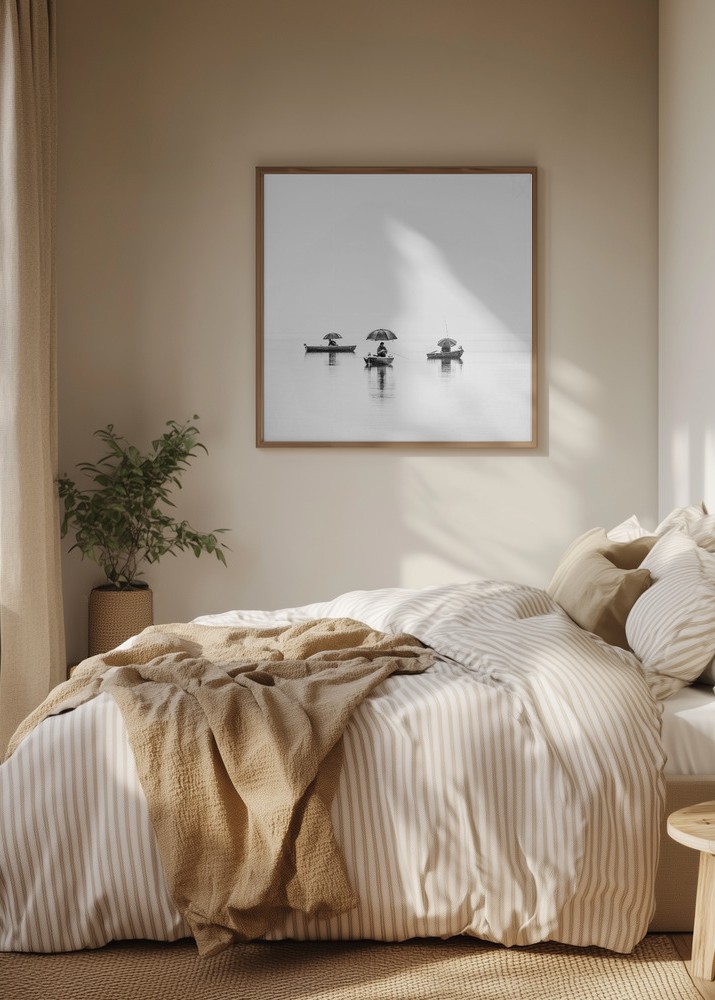 Denna eleganta poster fångar lugnet i en stilla sjöscen med tre båtar vilande på spegelblankt vatten. Motivet förmedlar en känsla av ro och balans, vilket gör det till ett perfekt tillskott för den som söker en minimalistisk touch i sin inredning. De detaljerade inslagen av båtar och parasoller i denna print skapar en intressant kontrast mot den mjuka vattenytan.