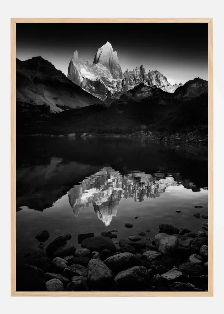 En naturskön poster med en dramatisk sjö omgiven av höga berg. En ljus skärva av vita isiga berg står i mitten av de svarta bergen. Reflektionen skimrar dramatiskt på ytan av sjön. Känn hur imponerande naturen är i den här bilden.