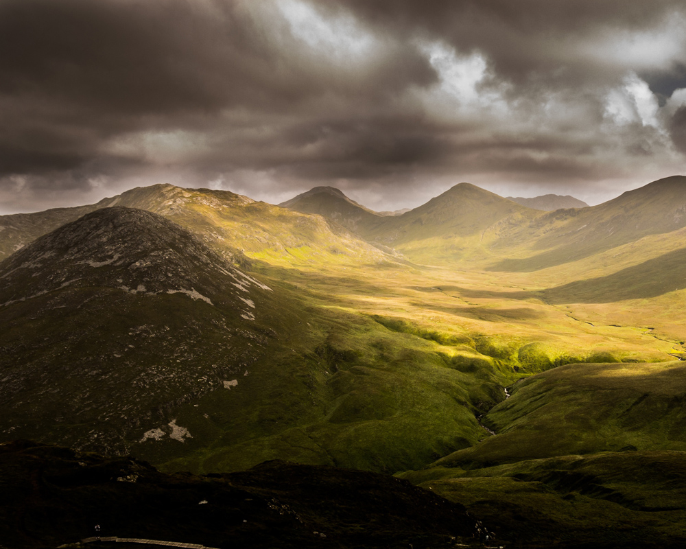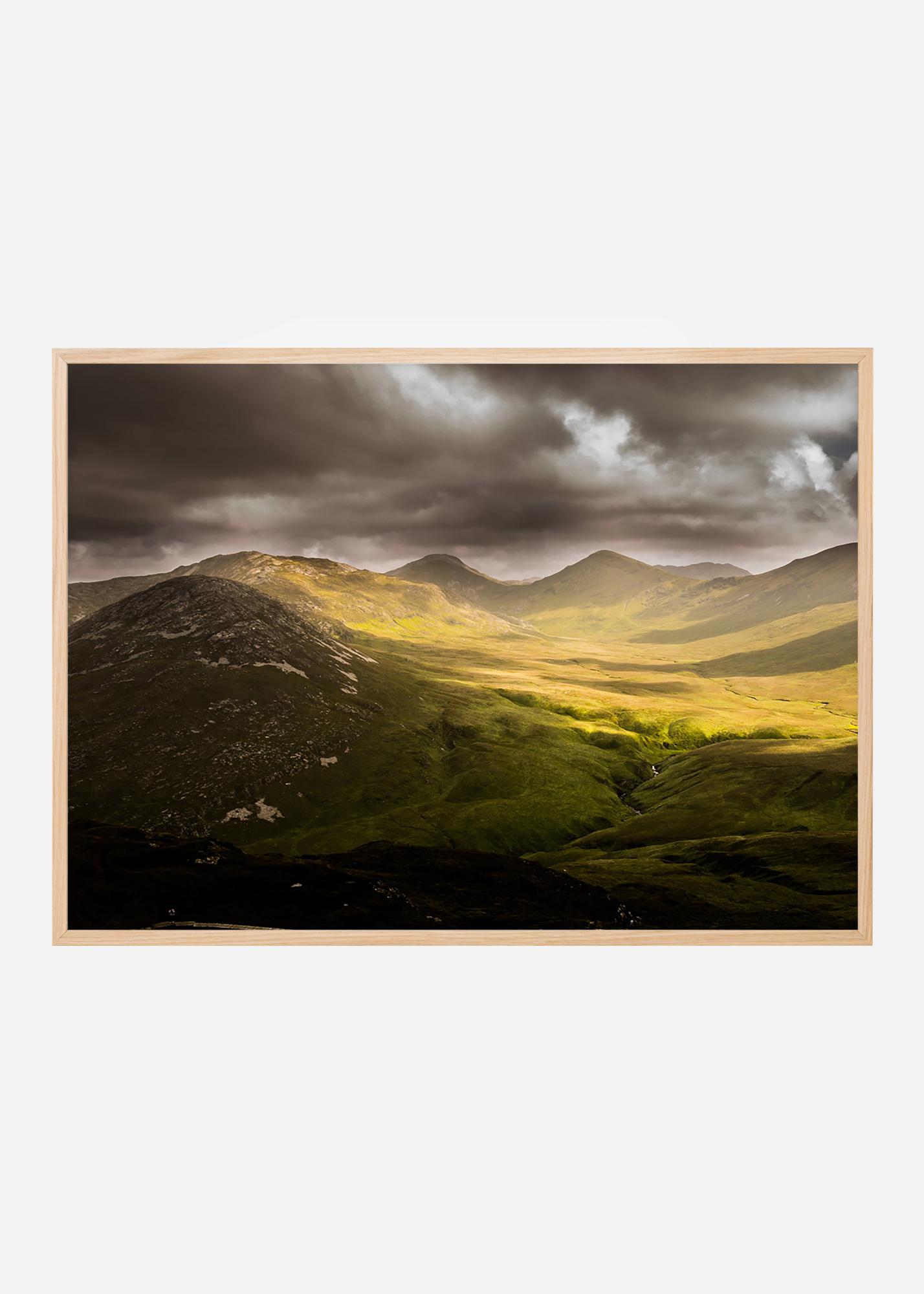 Dramatiskt landskapsporträtt med stormmoln som tornar upp sig över en bergskedja medan solen lyser upp dalgången nedanför. Dova dämpade färger understryker det dramatiska i bilden och gör att fotografiet verkligen sticker ut. Passar bäst i en ram som framhäver djupet i bilden och inte stjäl uppmärksamhet från motivet.