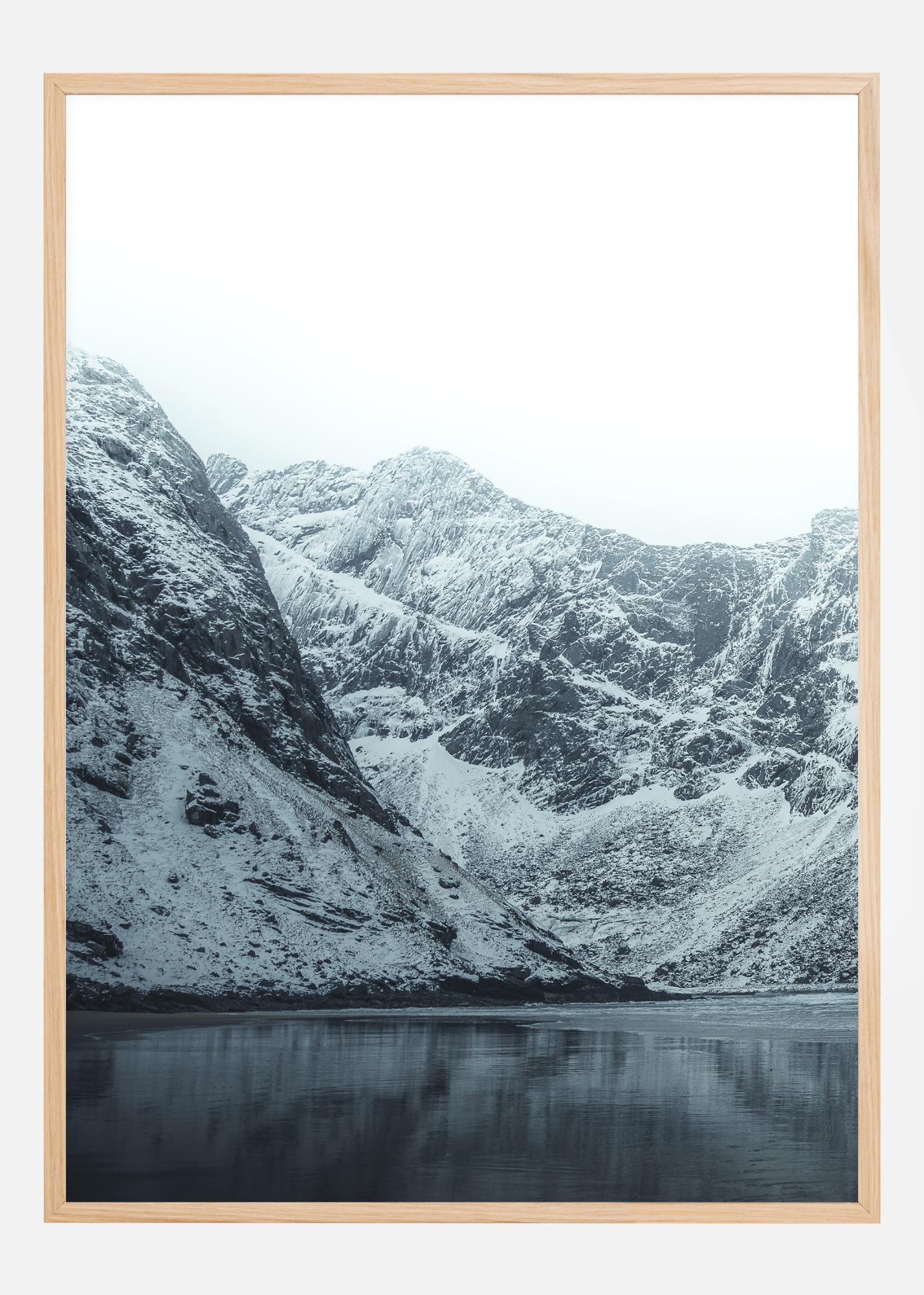 En dramatisk poster med snötäckta berg som leder ner mot ett stilla vatten. En sjö eller kanske en fjord sträcker sig mot de snöiga bergen och möter dem i förgrunden. En ljus vit himmel hjälper till att skapa en känsla av vinter. Ta med det kalla vädret inomhus när du hänger upp den här bilden.