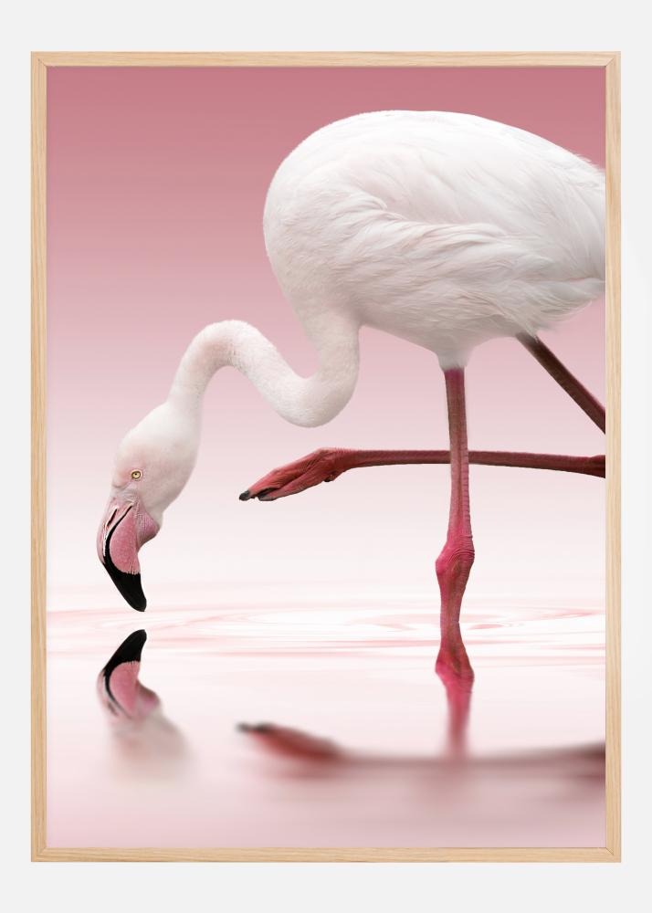 En abstrakt poster med en rolig och livfull rosa flamingo. Flamingon består av olika enkla linjer av varmt rosa och gult. Han tar höga steg över den blekrosa bakgrunden. För ett sött och festligt uttryck, häng den här på en vit vägg och låt färgerna lysa upp.
