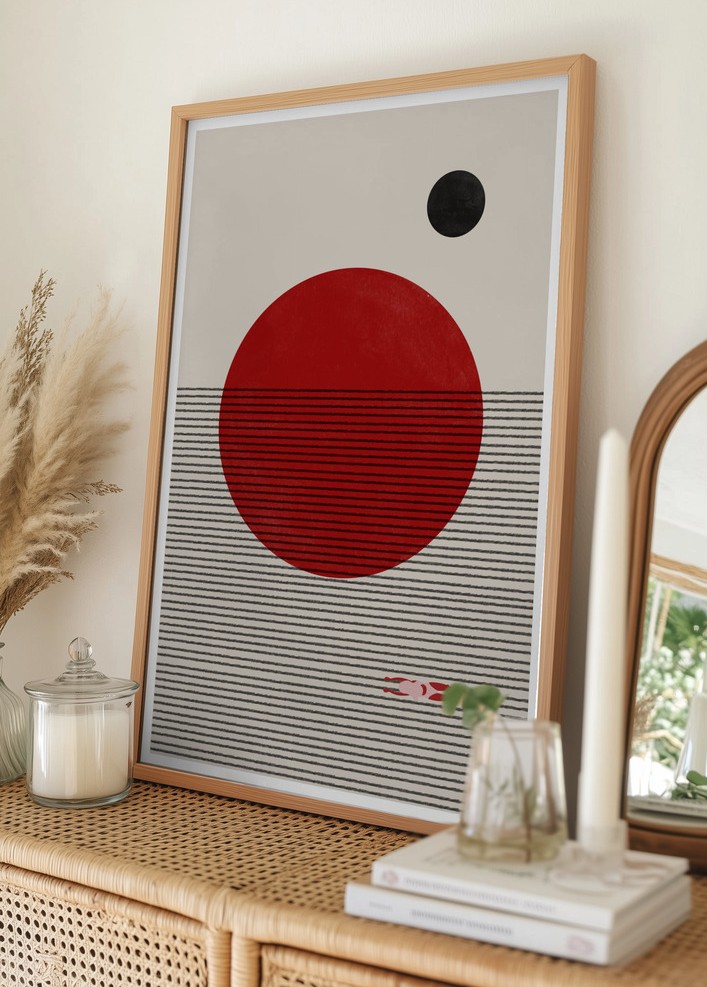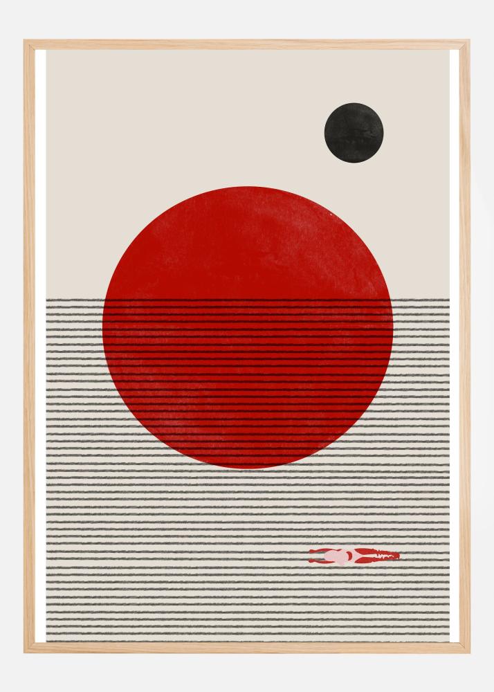 Denna stilfulla poster visar ett modernt och minimalistiskt motiv som lätt fångar blicken. I centrum står en stor röd cirkel som dominerar bilden, omgiven av ett lugnande gråbeige bakgrundsfält. Över den röda cirkeln svävar en mindre svart cirkel, vilket skapar en fascinerande kontrast och ger affischen ett dynamiskt uttryck.