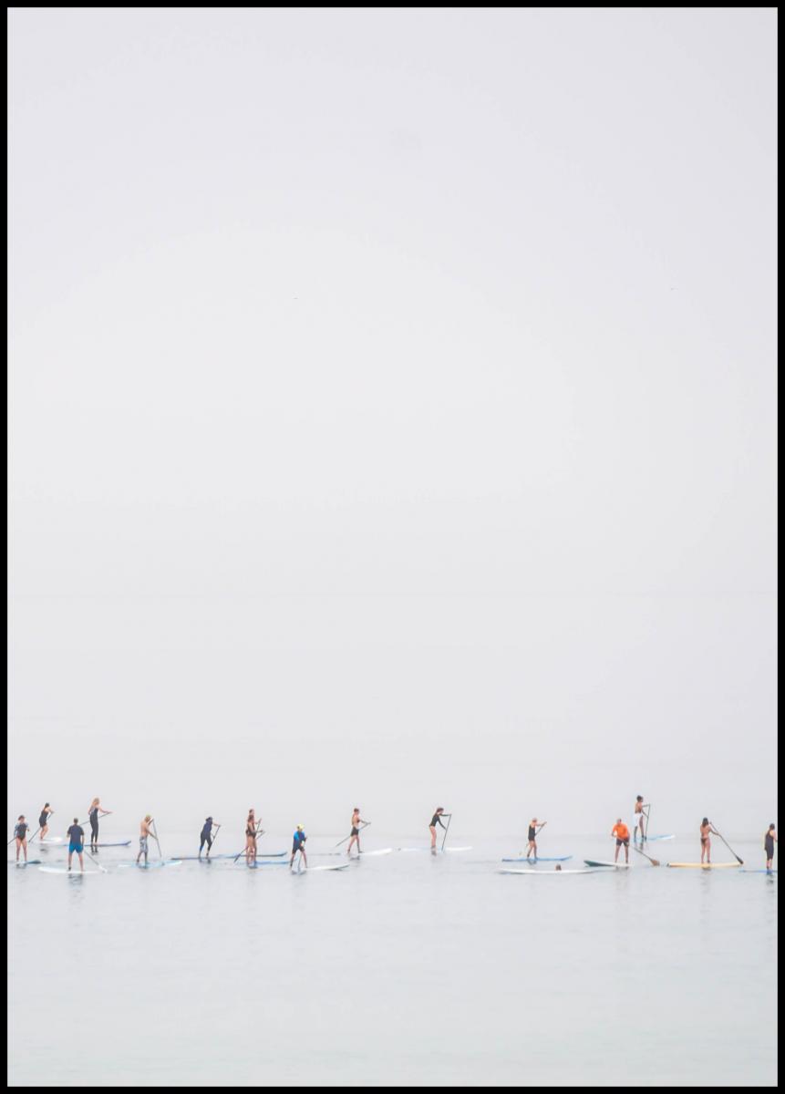 En vidvinkelsposter med en grupp barn som leker i havet. Ta in storheten i detta minimalistiska verk. Alla barnen fyller nederdelen av bilden medan det stora havet och himlen sträcker ut sig ovanför och under dem. Skapa illusionen av ljus och rymd med denna vidsträckta bild.