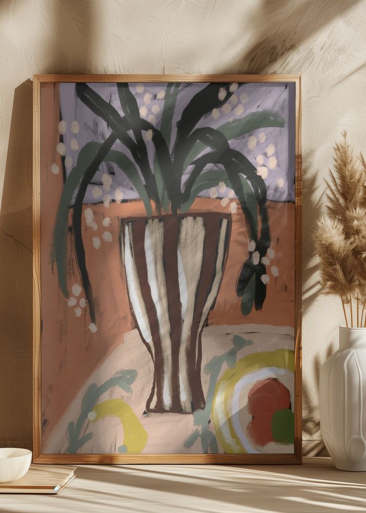 Skapa en varm och inbjudande atmosfär i ditt hem med denna samtida konstposter som framhäver en abstrakt komposition av en växt i kruka. Bildens konstnärliga stil kännetecknas av breda penseldrag och en spelad enkelhet, vilket gör den till en perfekt följeslagare för moderna, minimalistiska eller skandinaviska inredningar. Den här printen är målad i en palett som domineras av varma toner av aprikos och terrakotta, kontrasterat med inslag av cremevitt, djupbrunt och nyanser av lila som skapar en upplyftande känsla i rummet.