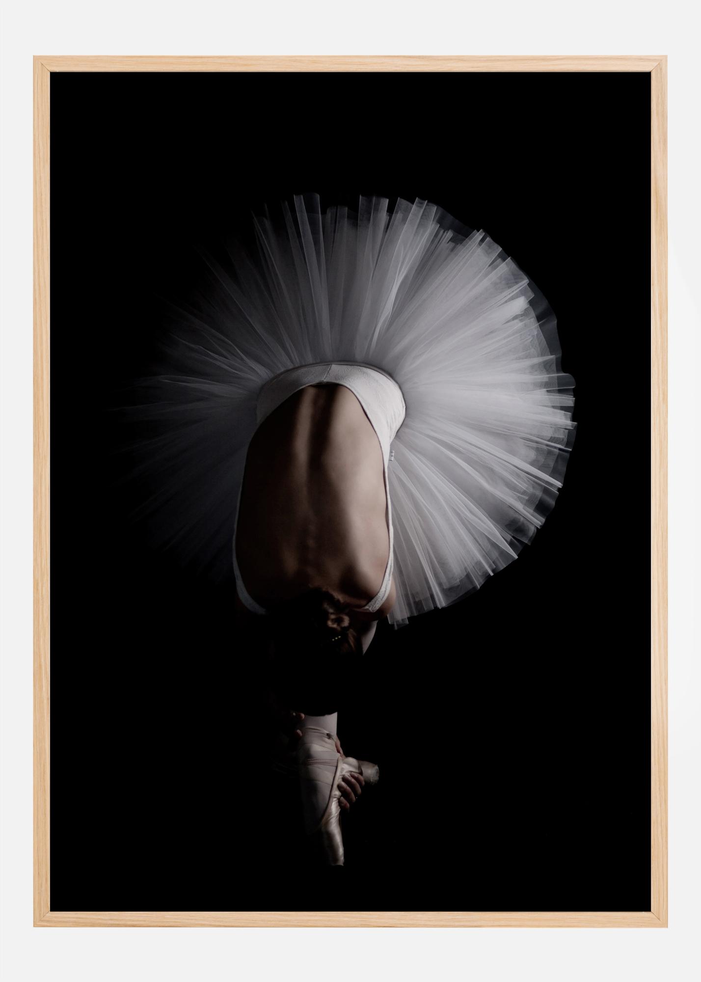 En dramatisk flygbildsposter med en ballettdansare som böjer sig framåt för att nå sina skor. Den svarta bakgrunden gör att den vita balettkjolen sticker ut i en ljus cirkel runt henne. De starka linjerna i ryggen leder ögat till de elegant tillspetsade fötterna. Elegans och drama smälter samman i denna unika bild.