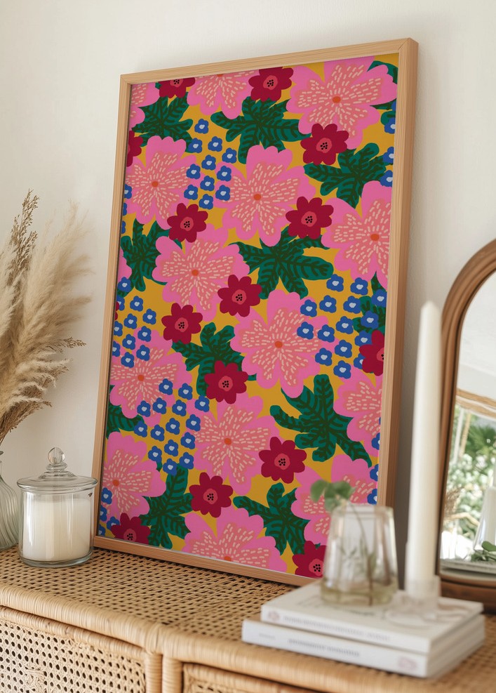 Denna livfulla poster erbjuder ett färgsprakande blommotiv som sprider glädje och stil i vilket rum som helst. Affischen är fylld med stora rosa blommor som står i vacker kontrast mot den gula bakgrunden. Här finns även mindre röda blommor som tillför djup och intensitet till designen. Detta print är perfekt för den som vill lägga till en pop av färg i sitt hem.