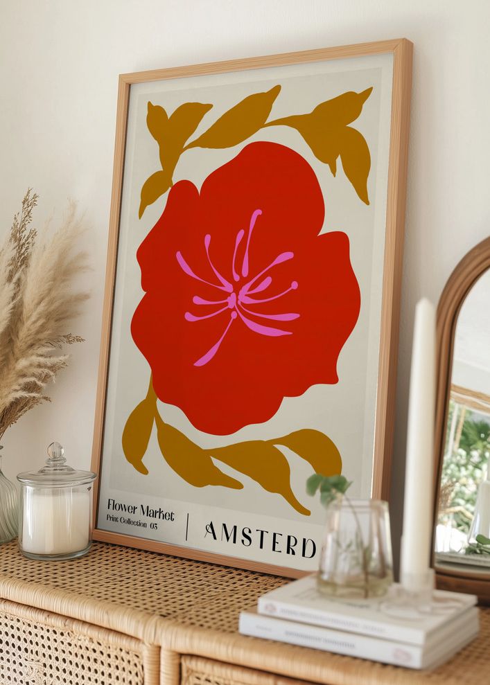 Denna poster bjuder på ett stilrent och modernt motiv från vår "Flower Market" print-kollektion. Dominerad av en stor röd blomma framhävs en livlig och färgstark design. Runt den röda blomman finns detaljer i guldbrunt och en dämpad beige bakgrund som skapar en harmonisk kontrast. Perfekt för att ge liv och färg till vilket rum som helst.