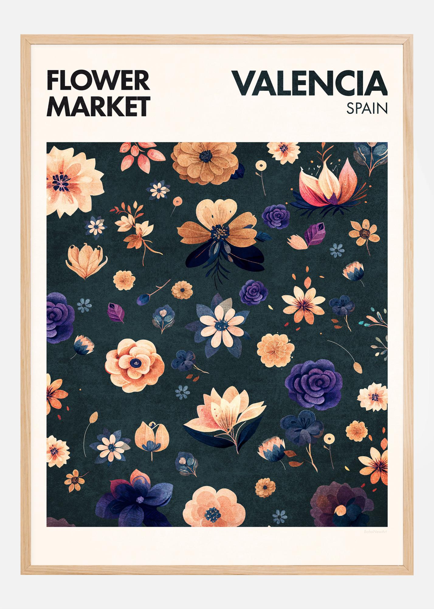 Denna färgrika och livfulla poster avbildar blomsterprakten från Valencias blomstermarknad i Spanien. Det detaljrika motivet är en hyllning till marknadens mångfald av blommor, där varje sort och färg tycks ha fångats i full blom. Från de delikata pastellerna till de djärva, mättade färgerna, fångar designen känslan av en lummig oas mitt i stadens hjärta.