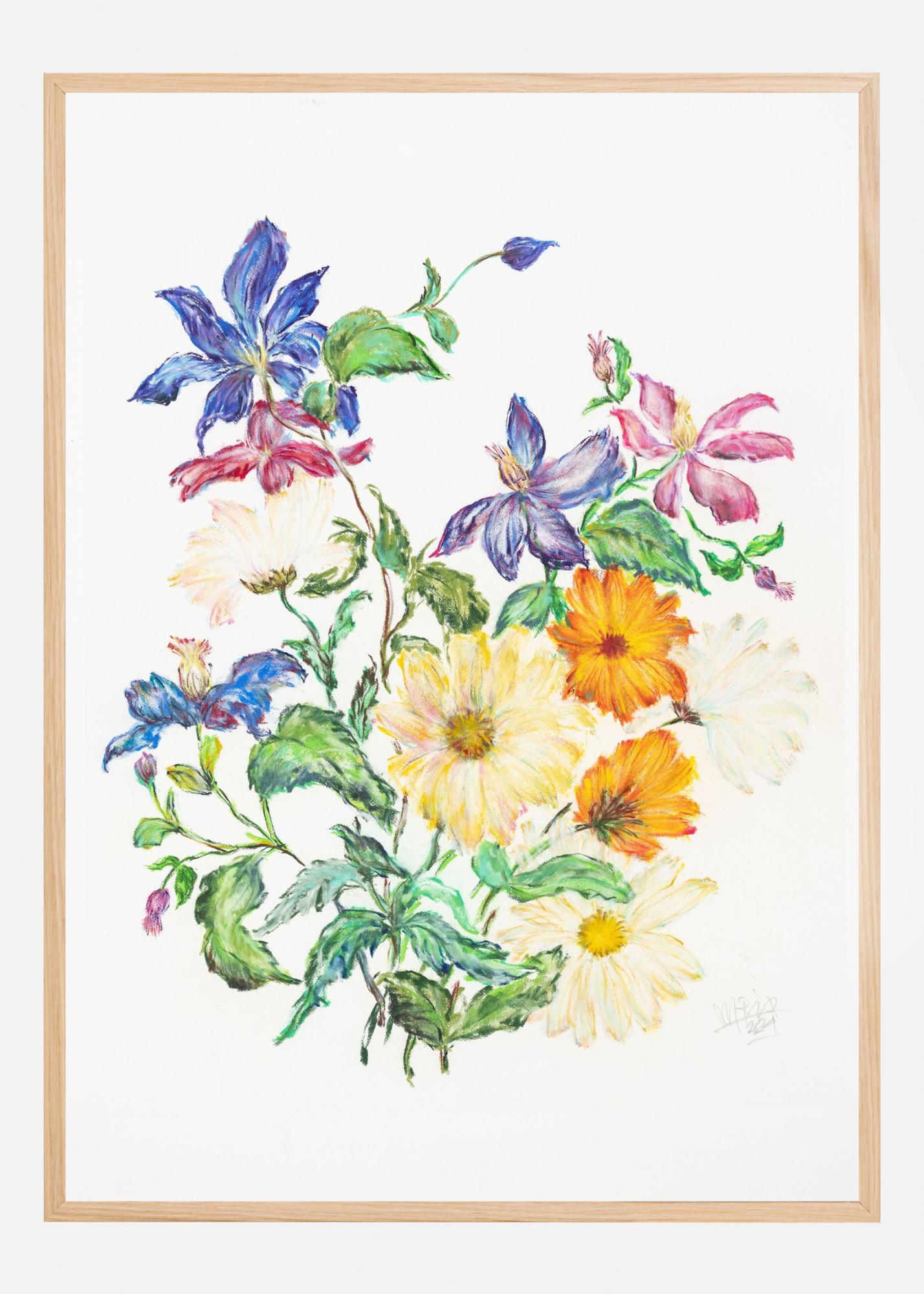 Den här vackra affischen fångar essensen av blomsterprakt med sina detaljerade illustrationer av olika blommor. Perfekt för att förgylla vilket rum som helst, drar detta print in betraktaren med sina levande och harmoniska detaljer. Motivet visar en bukett av blommor i full blom, vilket gör det till en idealisk poster för dem som älskar naturens skönhet.