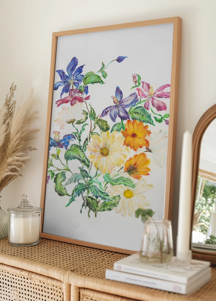 Affischen domineras av färger som lila, rosa, orange, gul och grön, vilket ger den en livfull och färgstark känsla. De konstnärliga penseldragen förstärker blommornas skönhet och framhäver deras mjuka nyanser. Med detta motiv kan du enkelt lägga till en färgklick i ditt hem eller kontor.