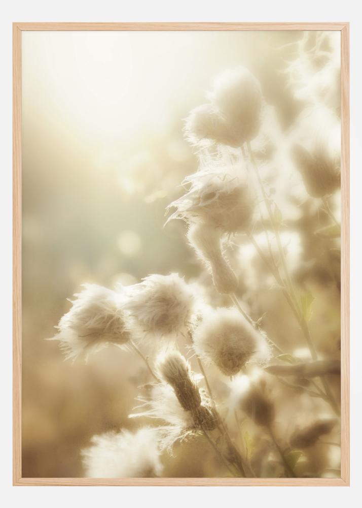 En magisk poster med fluffiga blommor i tidigt morgonljus. De mjuka bollarna på blommorna är upplysta av morgonljuset som skapar änglaglorior runt varje blomma. De mjuka pastellfärgerna hjälper till att skapa en sömnig, magisk känsla av en varsam väckning.