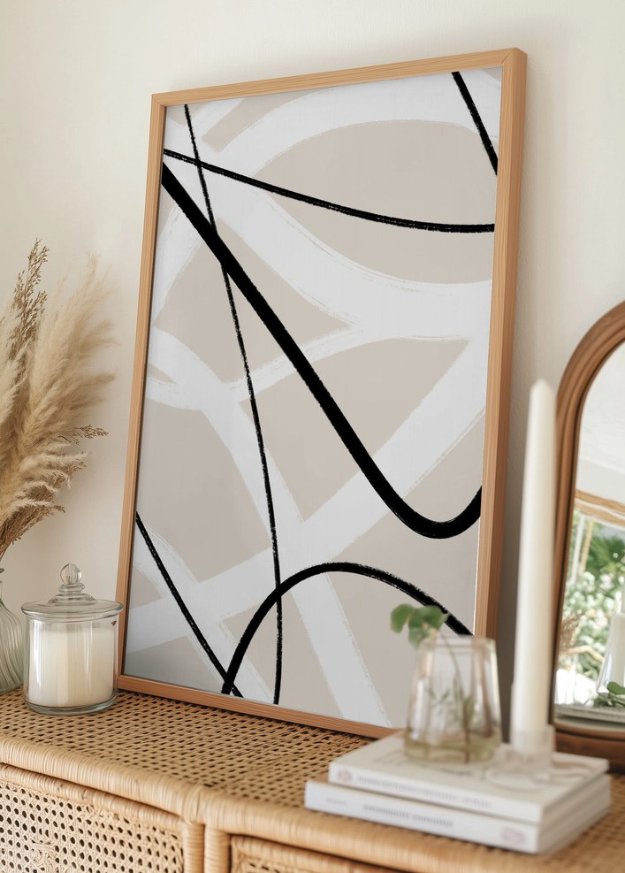 Färgpaletten består av djup svarta och mjuka beige toner som sammanflätas med inslag av vit, vilket ger en lugn och harmonisk känsla. Denna affisch är idealisk för den som söker ett smakfullt och enkelt konstverk att förgylla väggen med. Motivet är en utmärkt val för ett trendmedvetet hem eller som en del av en större gallerivägg.