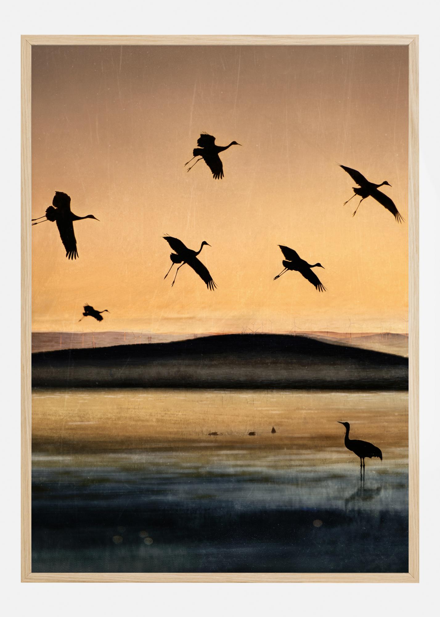 En stämningsfull poster med fåglar som flyger vid solnedgången. Sex storkar tar flykt, deras silhuetter i skarp kontrast mot en orange himmel och nedåtgående sol. En ensam fågel står i den blå- och guldfärgade sjön och tittar upp på resten när de flyger iväg. Känn friden av att flyga i den här varma postern.