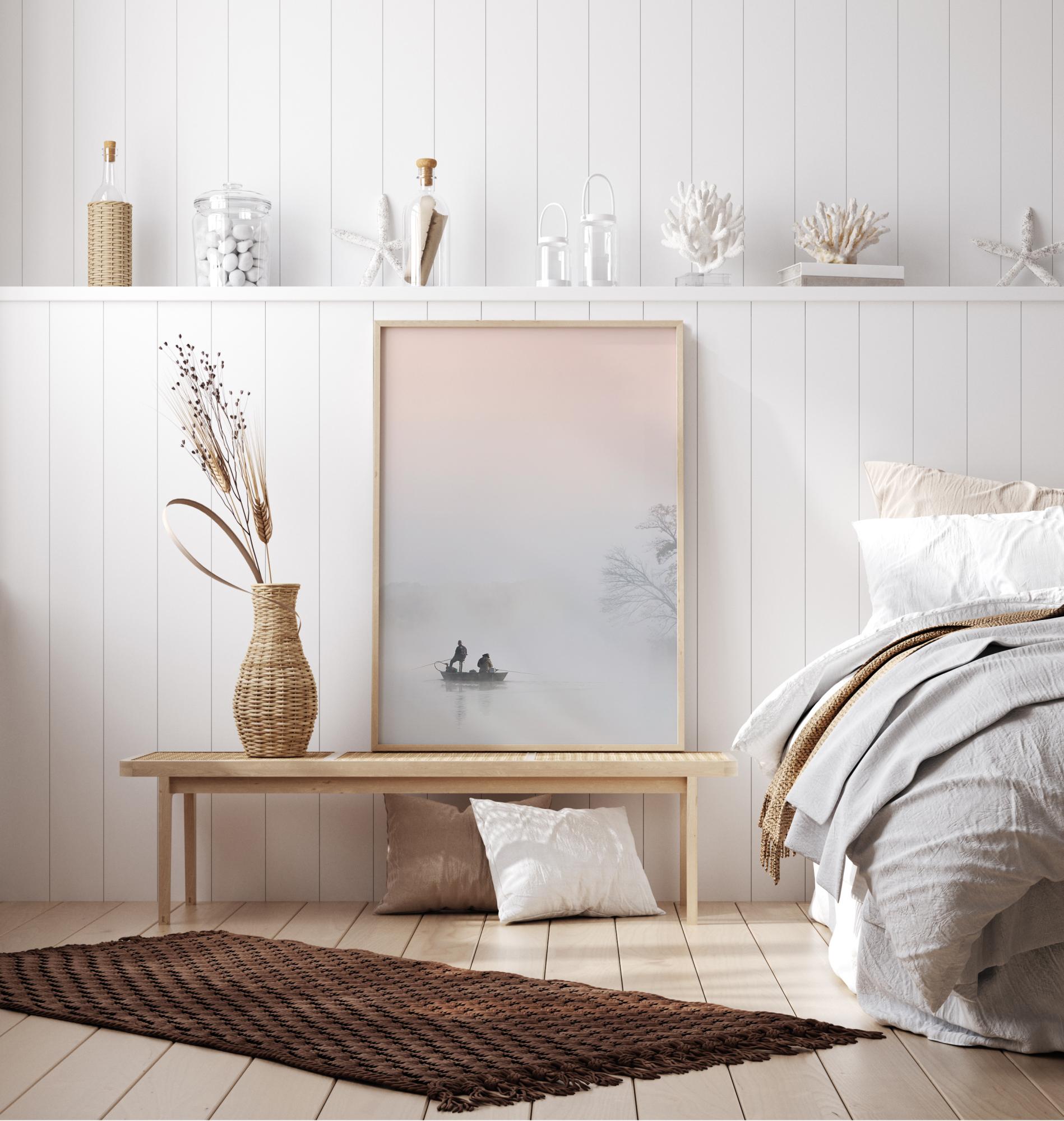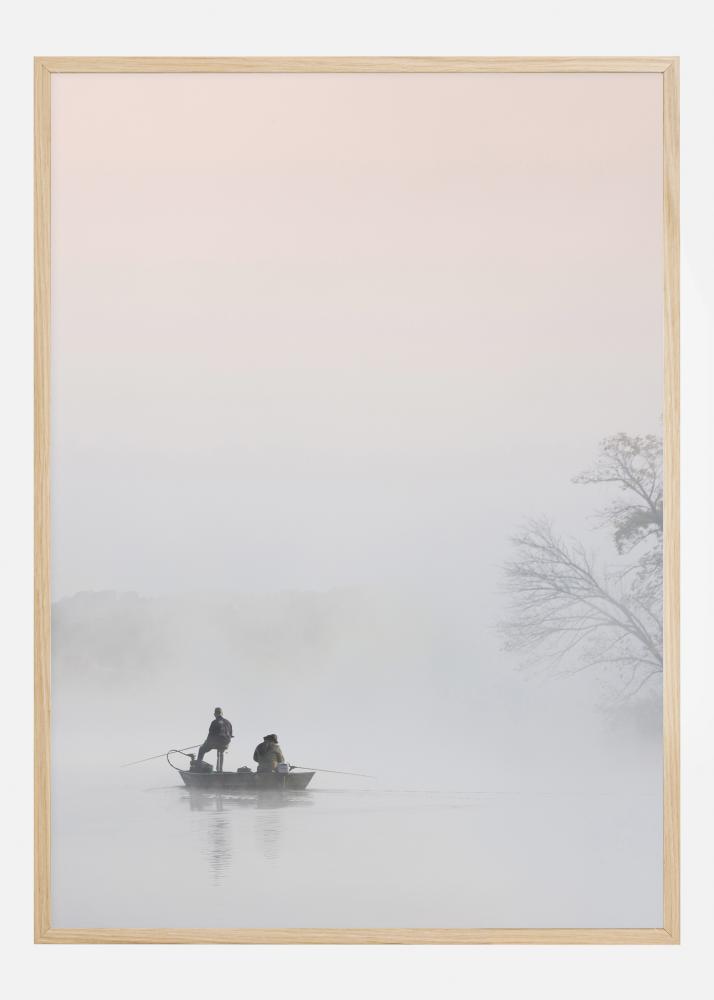 En magisk poster med två män som fiskar i en båt en dimmig morgon. Den lilla båten finns till vänster i silhuett. Trädgrenar kan ses till höger, men allt är höljt av en filt av vit dimma som gör det här till en magisk bild. Njut av friden en tidig morgon med denna poster.