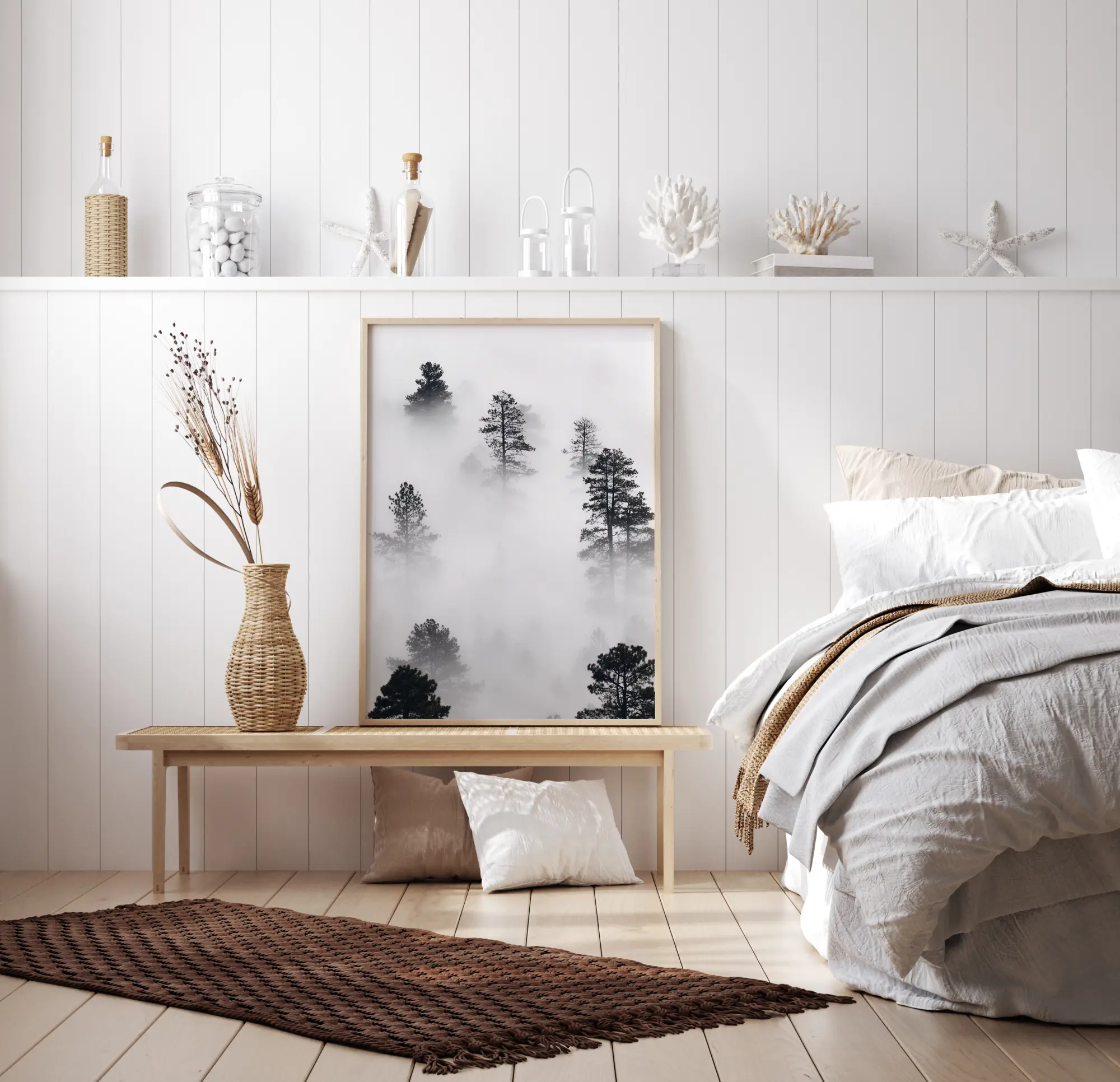 En fantastisk landskapsposter med en skog i dimma. Höga mörka trädtoppar spränger sig ut ur den bleka vita dimman och skapar en stark kontrast mellan dimma och träd. Ta med den svala vinterkänslan till ditt hem när du hänger den här på en neutral vägg.