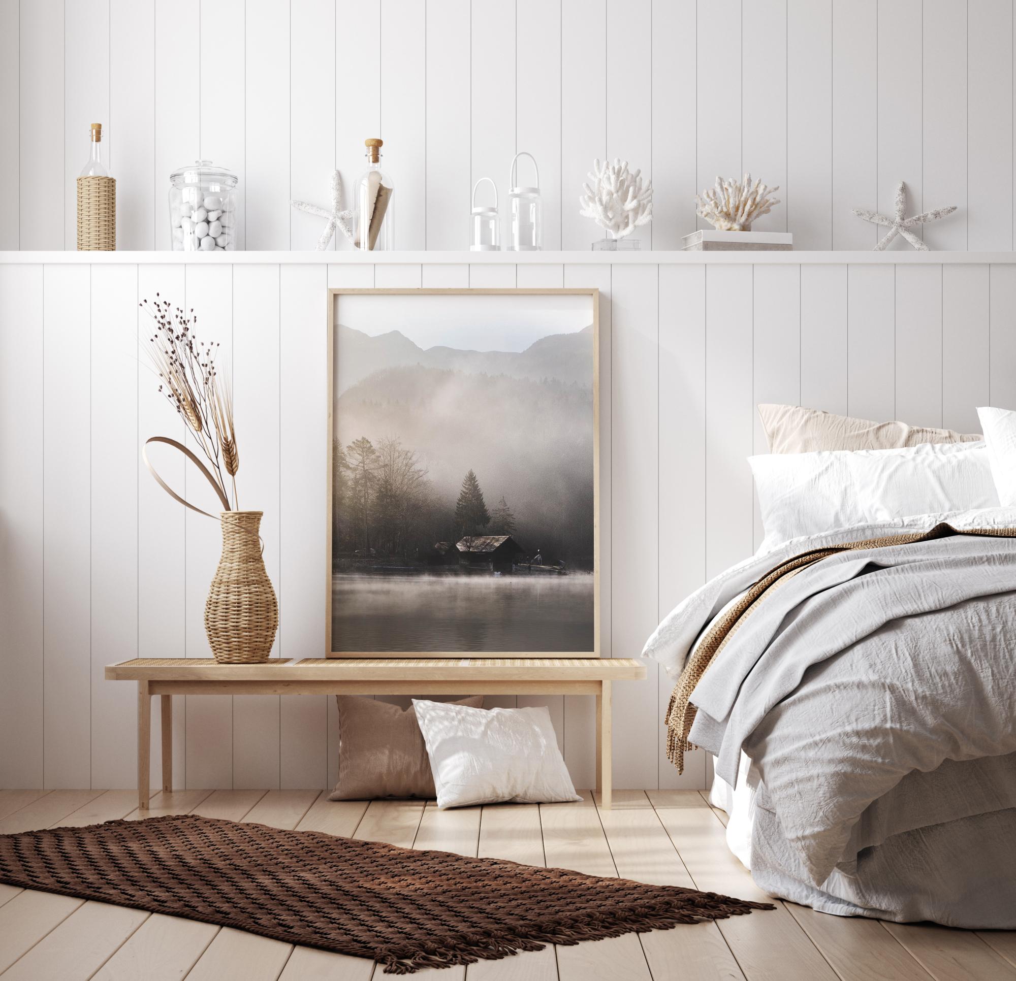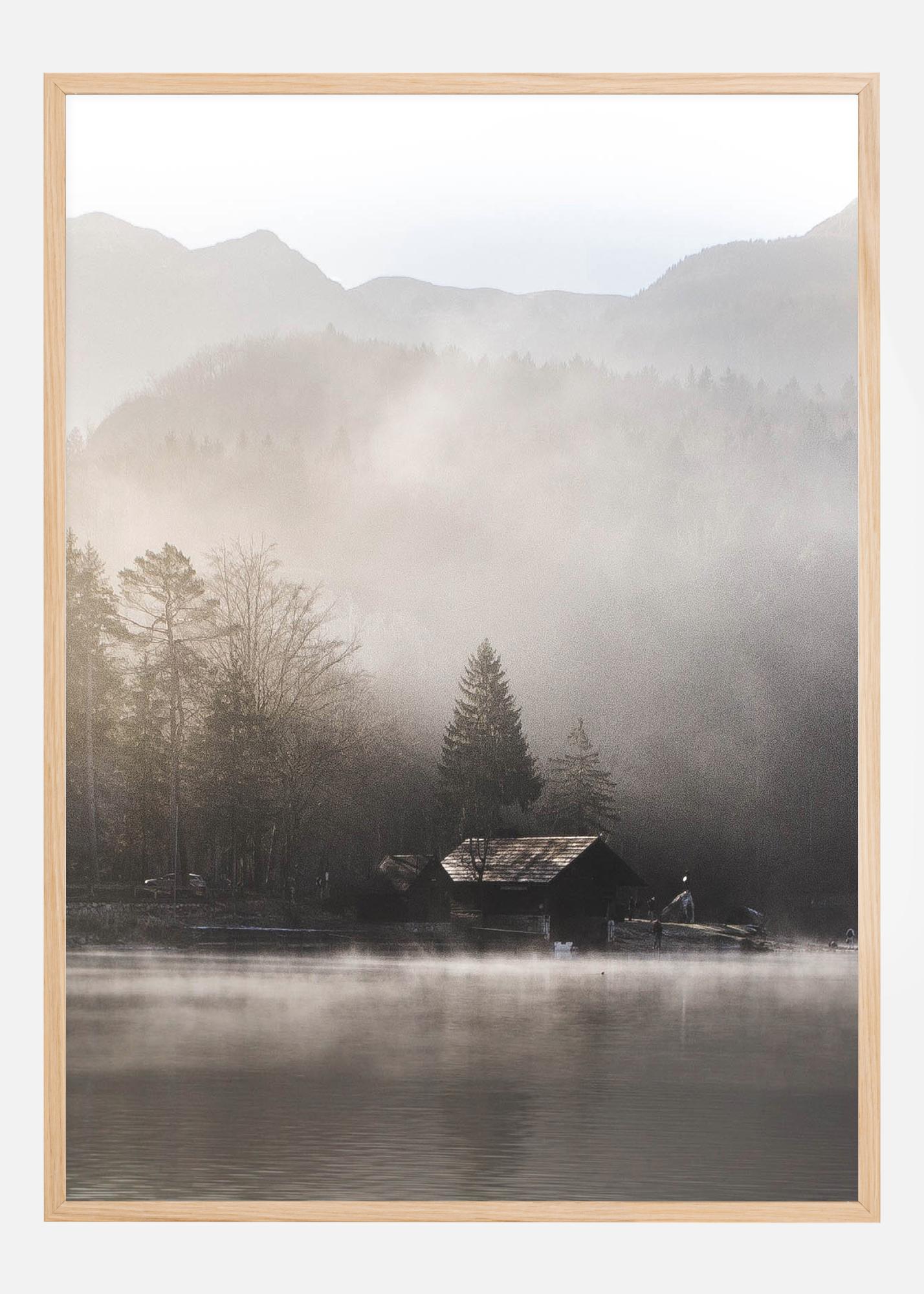 En behaglig poster med en stuga i bergen som ligger vid kanten av en dimmig sjö. Mjuka pasteller ger den här bilden en mild känsla där den tidiga morgonsolen strålar ner från höger för att lyfta dimman. Häng denna på en enkel vägg och gå vilse i den ensamma vildmarken och enkelheten i denna stämningsfulla poster.