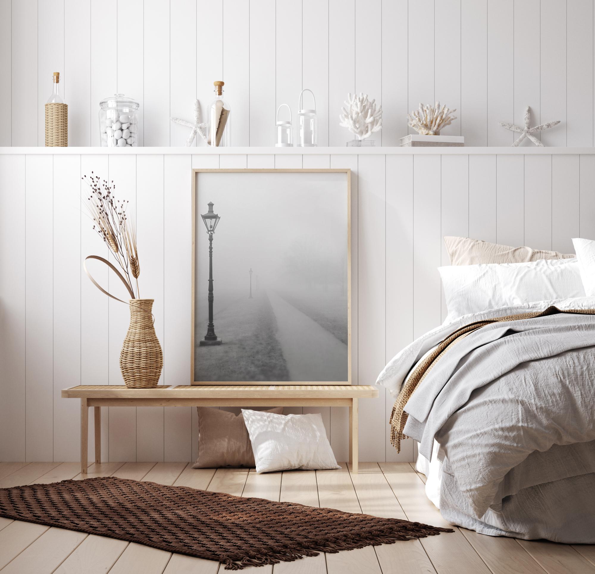 En urban poster med en dimmig gata. Gammaldags gatlampor följer en ensam väg som försvinner in i dimman i fjärran. Ett kuslig lugn finns i detta subtila foto som också för med sig en känsla av vinterkyla. Behåll känslan på det här fotot genom att hänga det på en vit vägg.