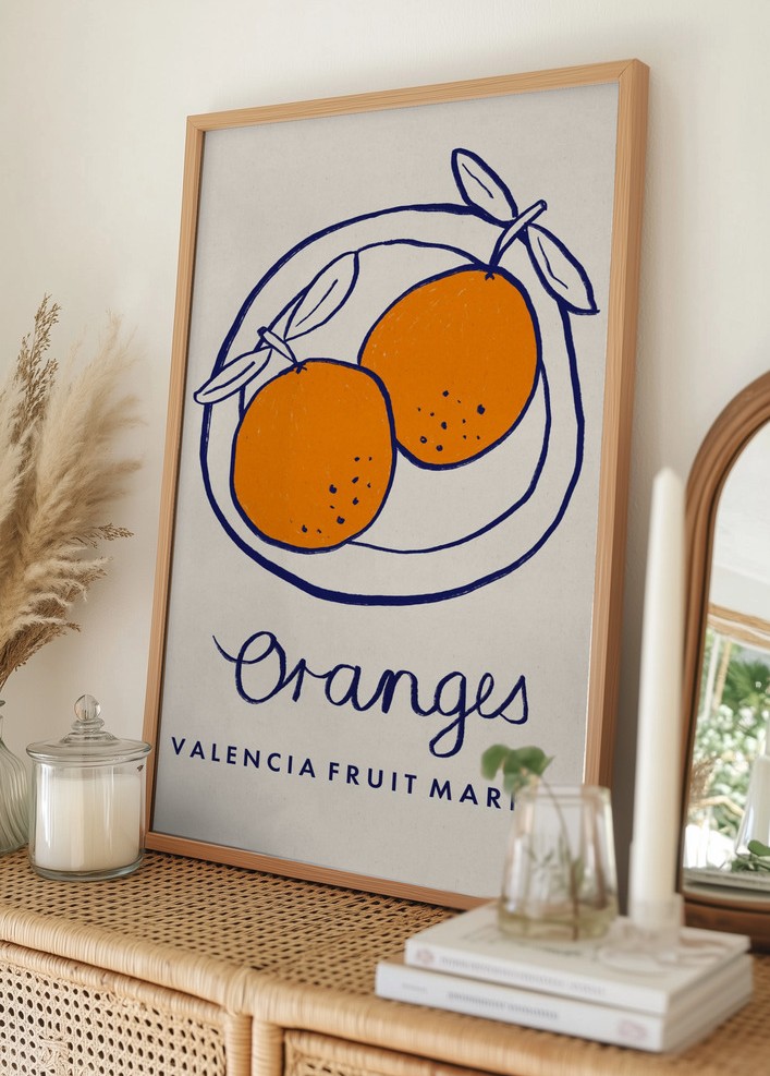 Motivet är i huvudsak blått och orange, vilket ger en fin kontrast och ett djärvt uttryck. Den djupa blåa färgen ramar in de klara orangea apelsinerna på ett sätt som gör att de verkligen står ut. Texten "Valencia Fruit Market" och "Oranges" i blått förstärker temat och ger en extra dimension till affischen. Ett perfekt val för dem som söker en print med en modern touch och en energisk färgpalett.