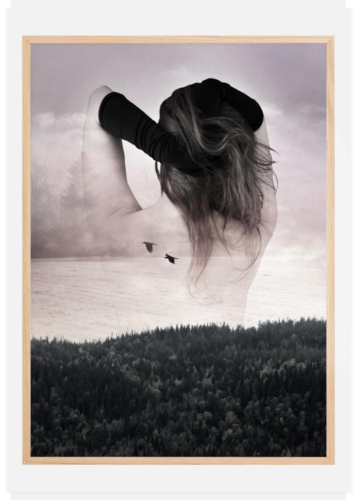 En kollageposter med skog och himmel underst och en kvinna i ett lager över bilden. Skogens själ är tydlig här, då den mörka skogen når upp till himlen där en kvinna med en svart handske drar handen genom sitt hår. Njut av den annorlunda sammansättningen i denna verkligt fantasifulla bild.