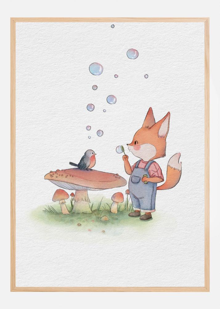 Upptäck vår charmiga poster som fångar en bedårande scen med en räv och en fågel i ett vänligt ögonblick. Denna illustration, perfekt för en barnkammare eller lekrum, utstrålar en känsla av värme och vänskap. Posterens motiv framställer den lekfulla räven klädd i överdragsbyxor och en rosa ryggsäck som blåser såpbubblor, medan den lilla fågeln, placerad på en svamp, ser på med glädje. De mjuka pastellfärgerna och akvarellkänslan skapar en drömlik och lugn atmosfär som lätt kan komplettera varje interiör.