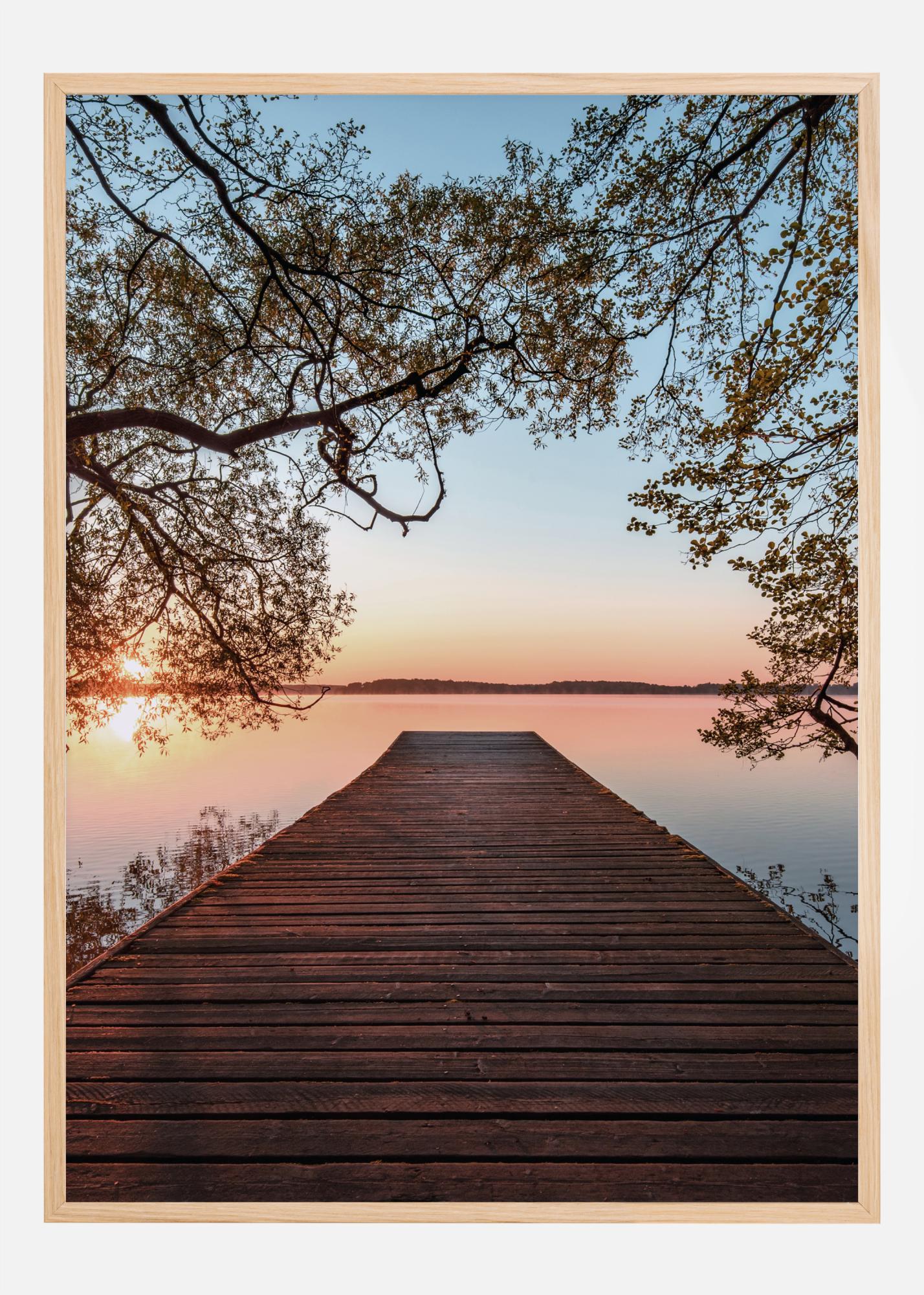 En stämningsfull poster med en brygga som går ut över en sjö en ljus dag. Trädgrenar ramar in bryggan som det leder bort mot den mjukt blå- och persikafärgade sjön och himlen. Få med en känsla av frihet när du tar med den här hem.